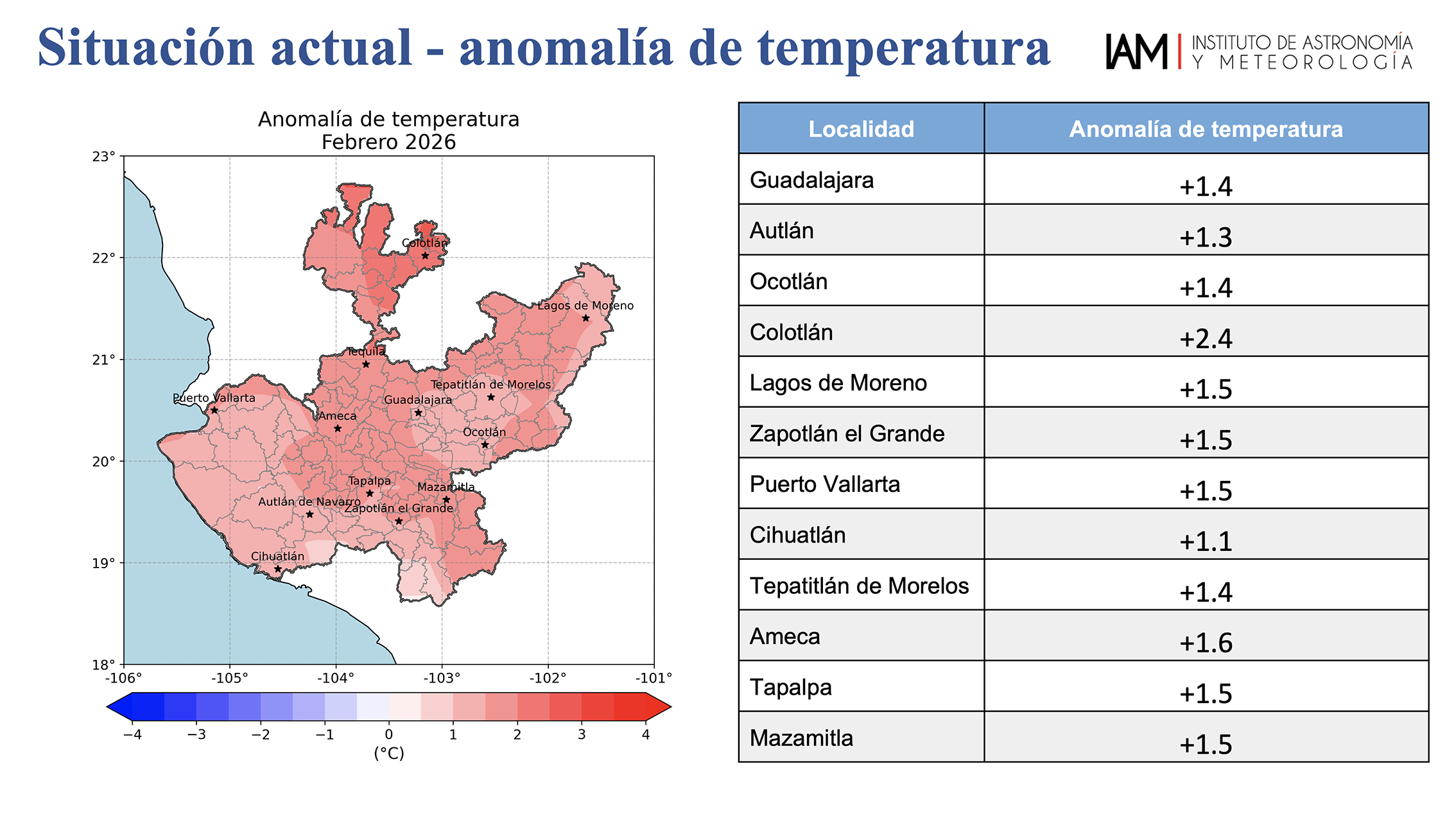 El mes de marzo traerá consigo temperaturas ligeramente más cálidas al promedio en la mayoría del estado, y las precipitaciones se mantendrán dentro o por debajo de la media, pronosticaron especialistas del Instituto de Astronomía y Meteorología (IAM), de la Universidad de Guadalajara (UdeG).