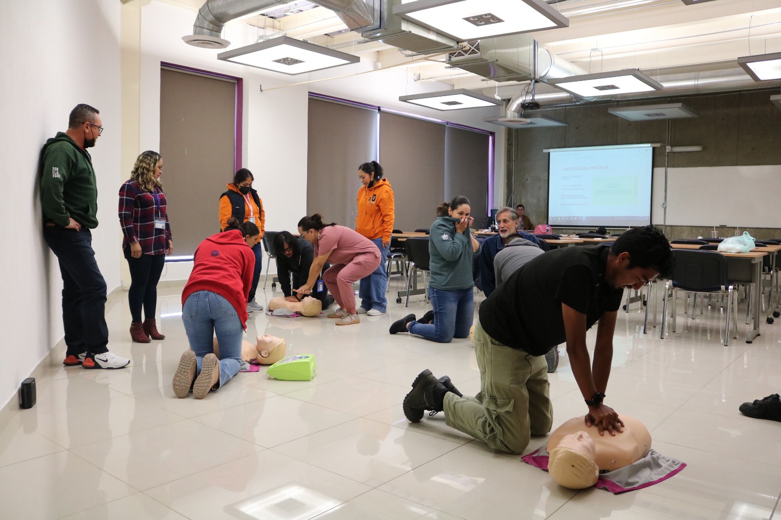 La segunda etapa, realizada de forma presencial los días miércoles 18 y viernes 20 de febrero, fue teórica y práctica e involucró el uso de maniquíes y un desfibrilador automático de entrenamiento.