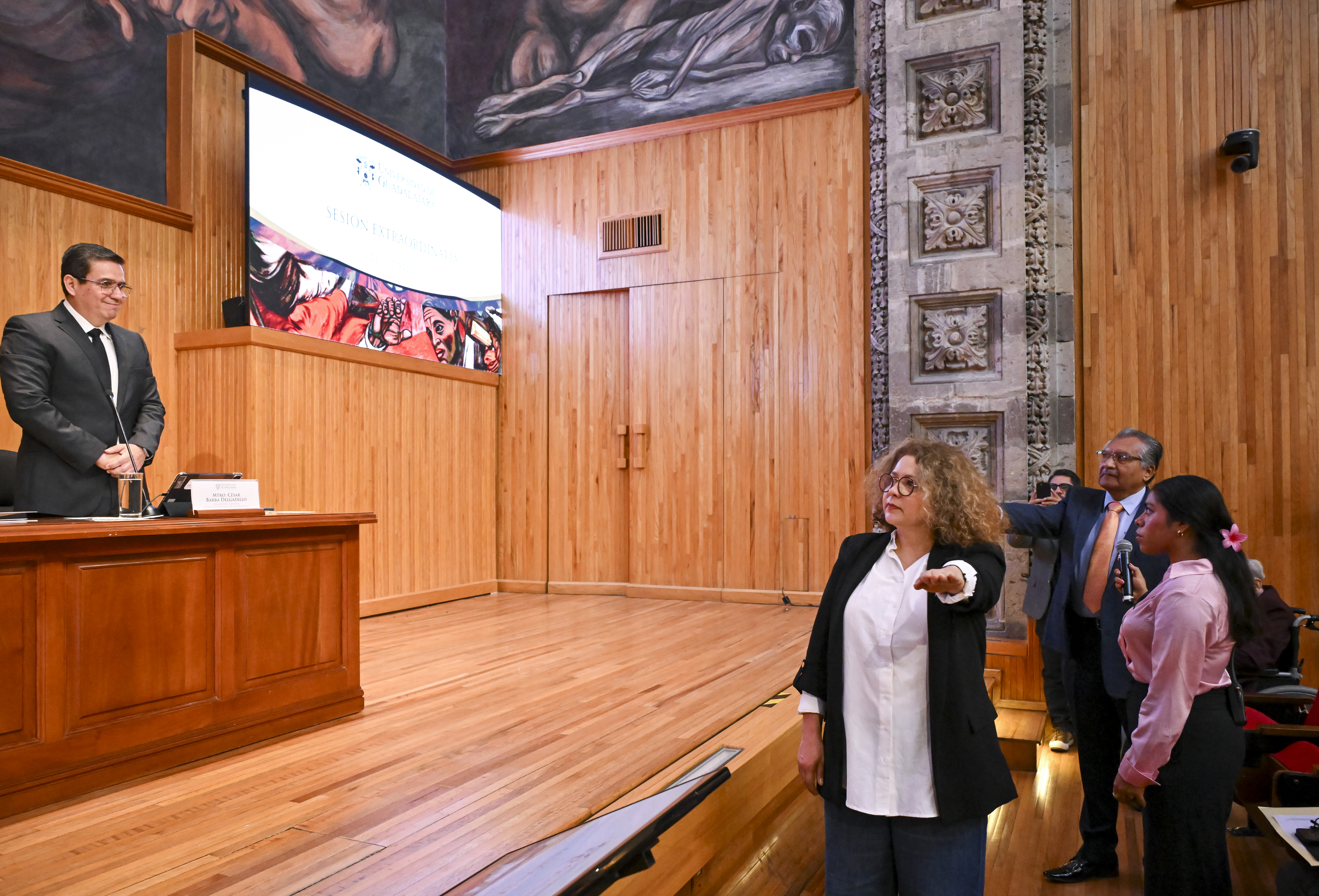 En la sesión, la Rectora General Karla Planter Pérez tomó protesta a la Secretaria General del Sindicato de Trabajadores Académicos de la UdeG, Érika Natalia Juárez Miranda, quien será representante del profesorado ante este órgano de gobierno universitario; así como a Jorge Alfonso Souza Joufred, Director de la División de Cultura, Arte y Sociedad, y Jorge Lozoya Arandia, Director de División de Sostenibilidad y Tecnología, quienes se incorporaron al Centro Universitario de Chapala (CUChapala).