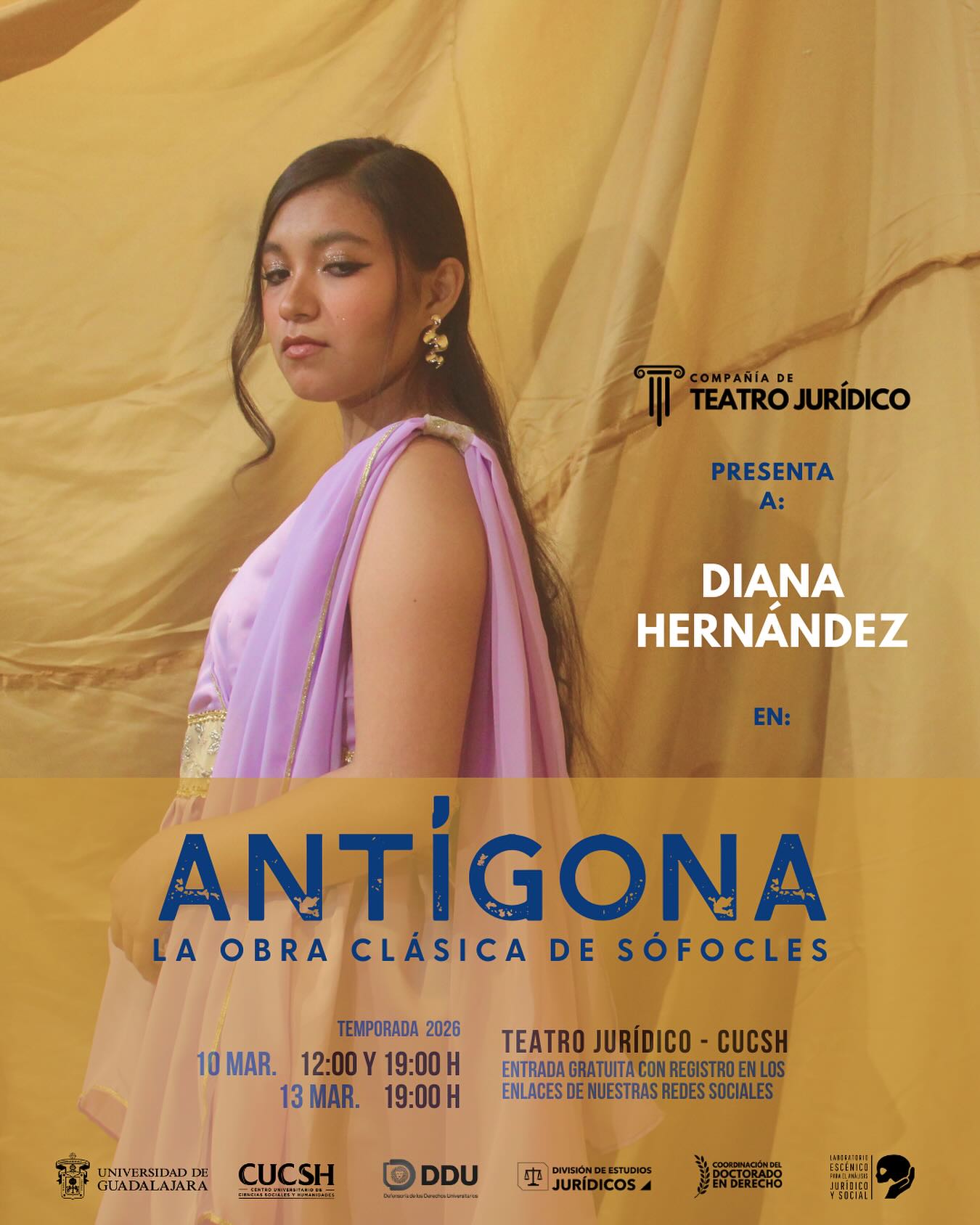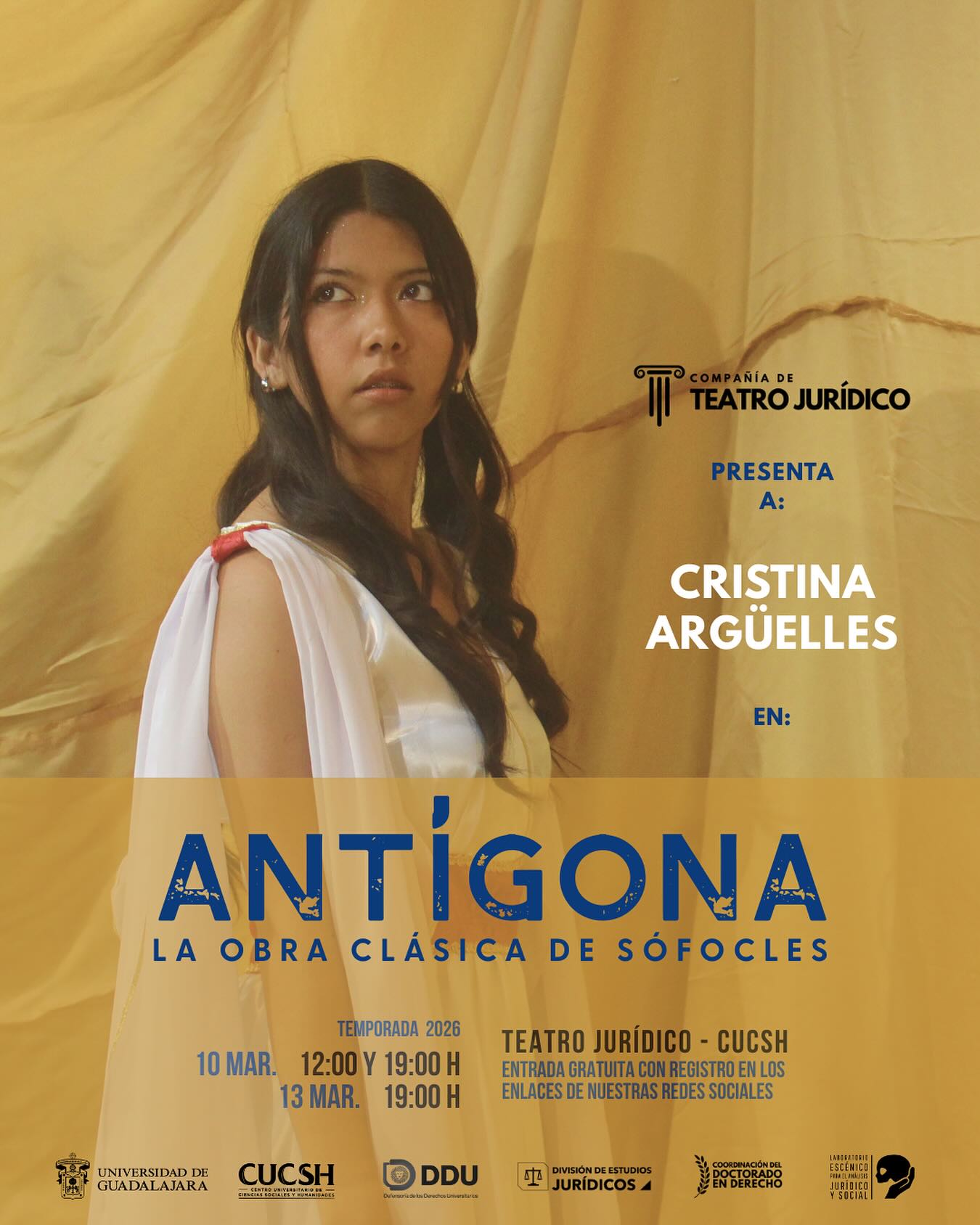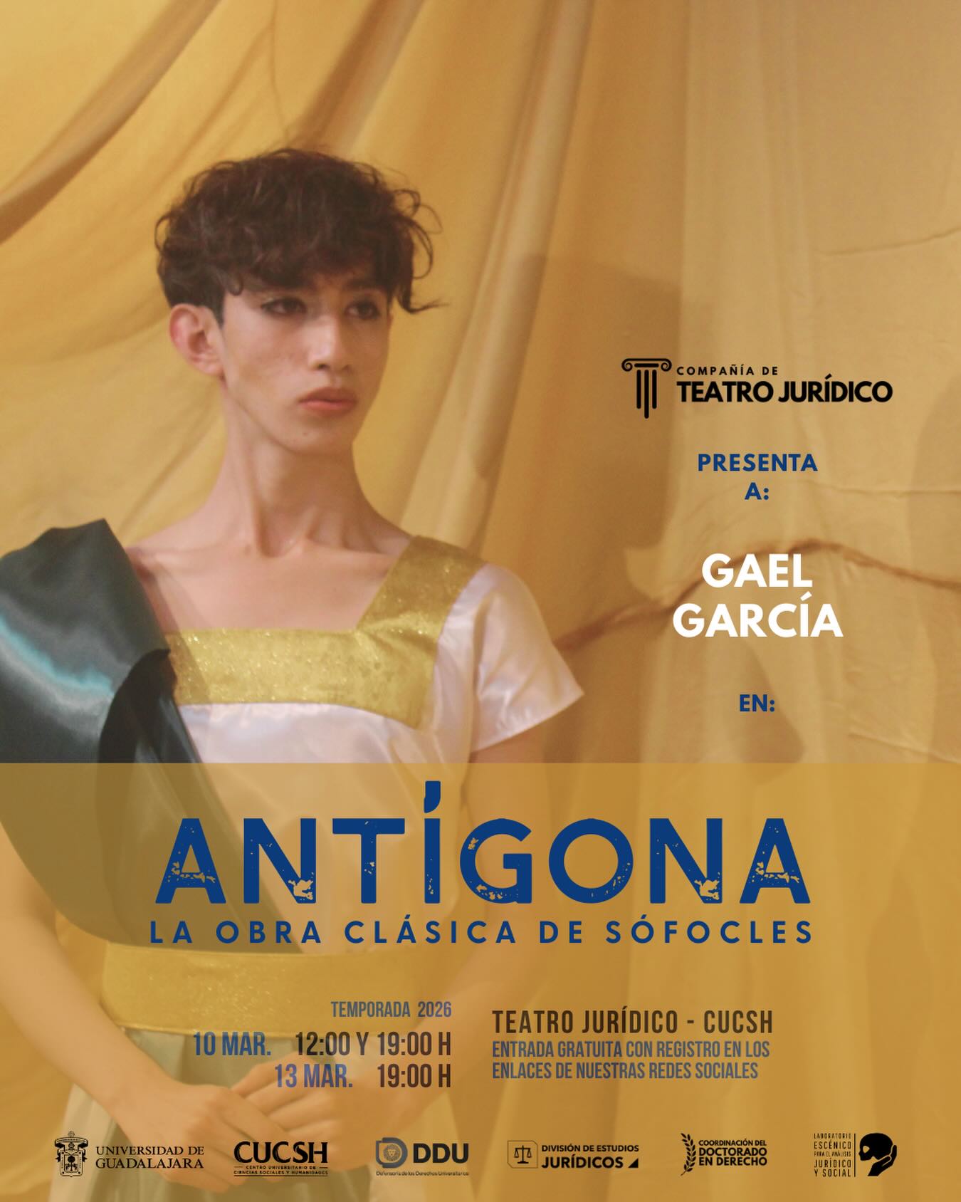 Las funciones de Antígona serán el en el Auditorio del Teatro Jurídico del CUCSH el 10 de marzo a las 10:00 y 19:00 horas y el 13 de marzo a las 19:00 horas. El ingreso es gratuito pero requiere registro previo en un formulario en línea o mediante el perfil de instagram @teatrojuridico.udg