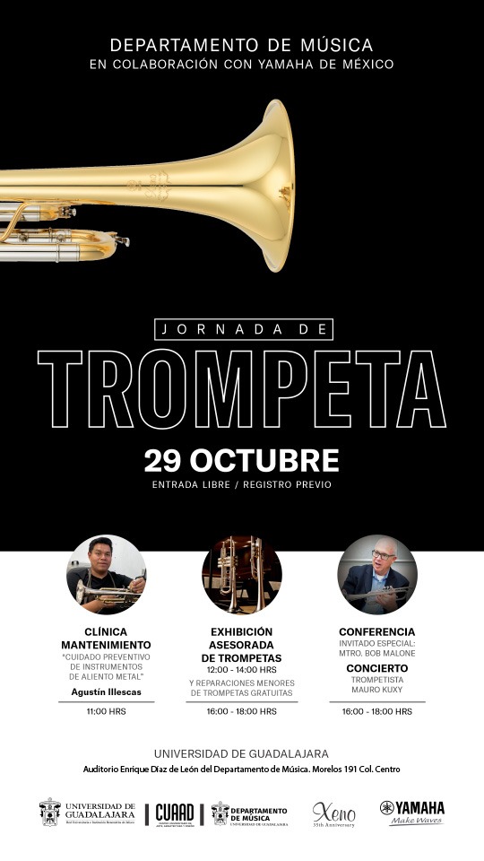 El Departamento de Música del Centro Universitario de Arte, Arquitectura y Diseño (CUAAD) anunció la Jornada de la Trompeta en alianza con la empresa Yamaha para el desarrollo de estudiantes, docentes y especialistas del instrumento.