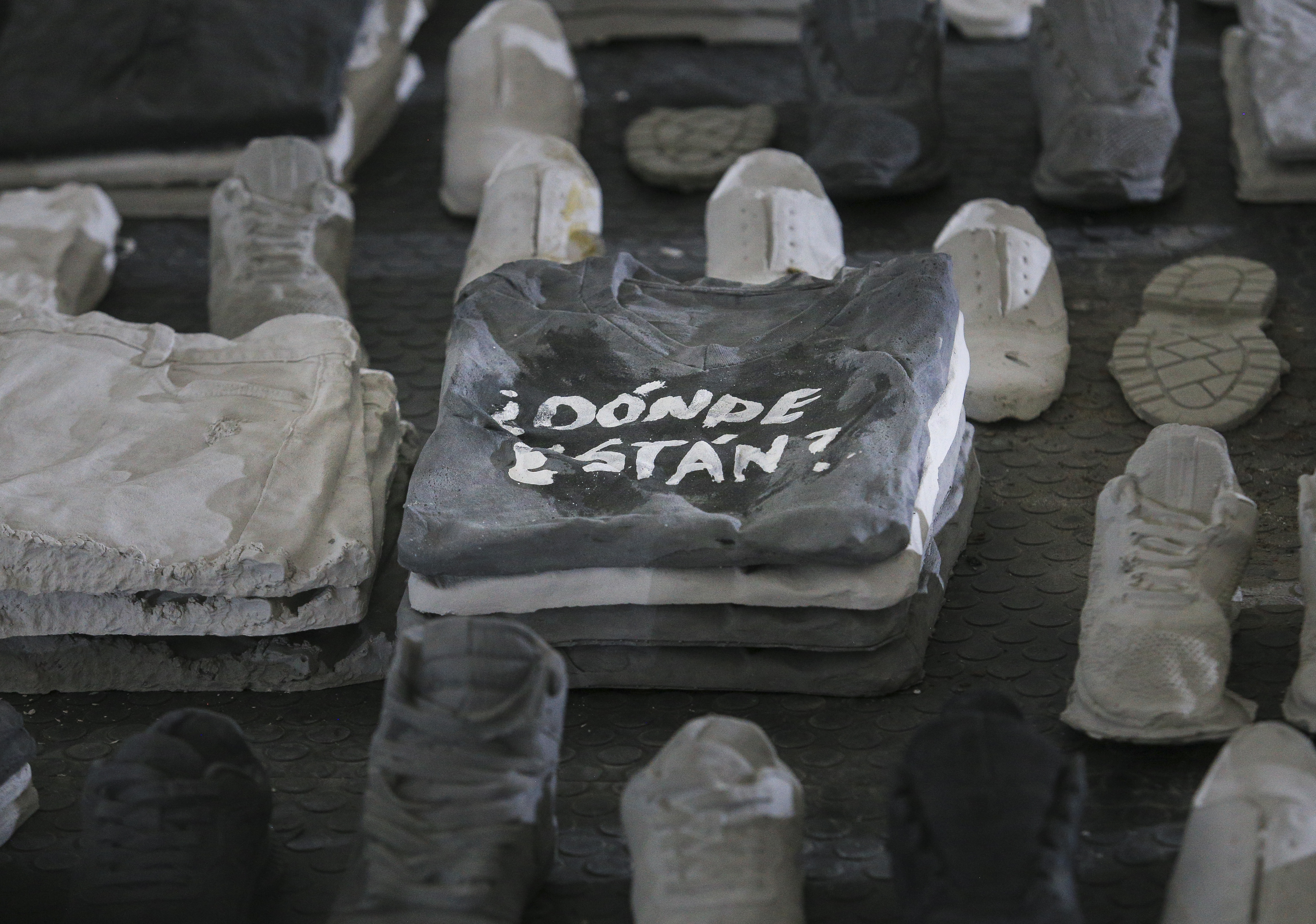En el suelo, pueden observar las piezas hechas de la tierra que apilan ropas, mochilas y pantalones, algunos con nombres o dedicatorias.