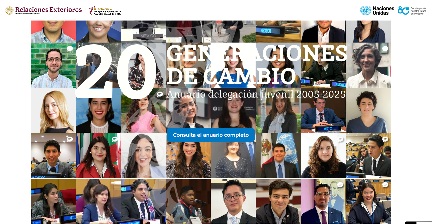 Como parte de la conmemoración de este aniversario, se inauguró la exposición fotográfica “Juventudes mexicanas que inspiran: 20 años iluminando el multilateralismo desde la ONU”, el 1 de octubre de 2025, en la Sala 3 del Instituto Matías Romero (CDMX).