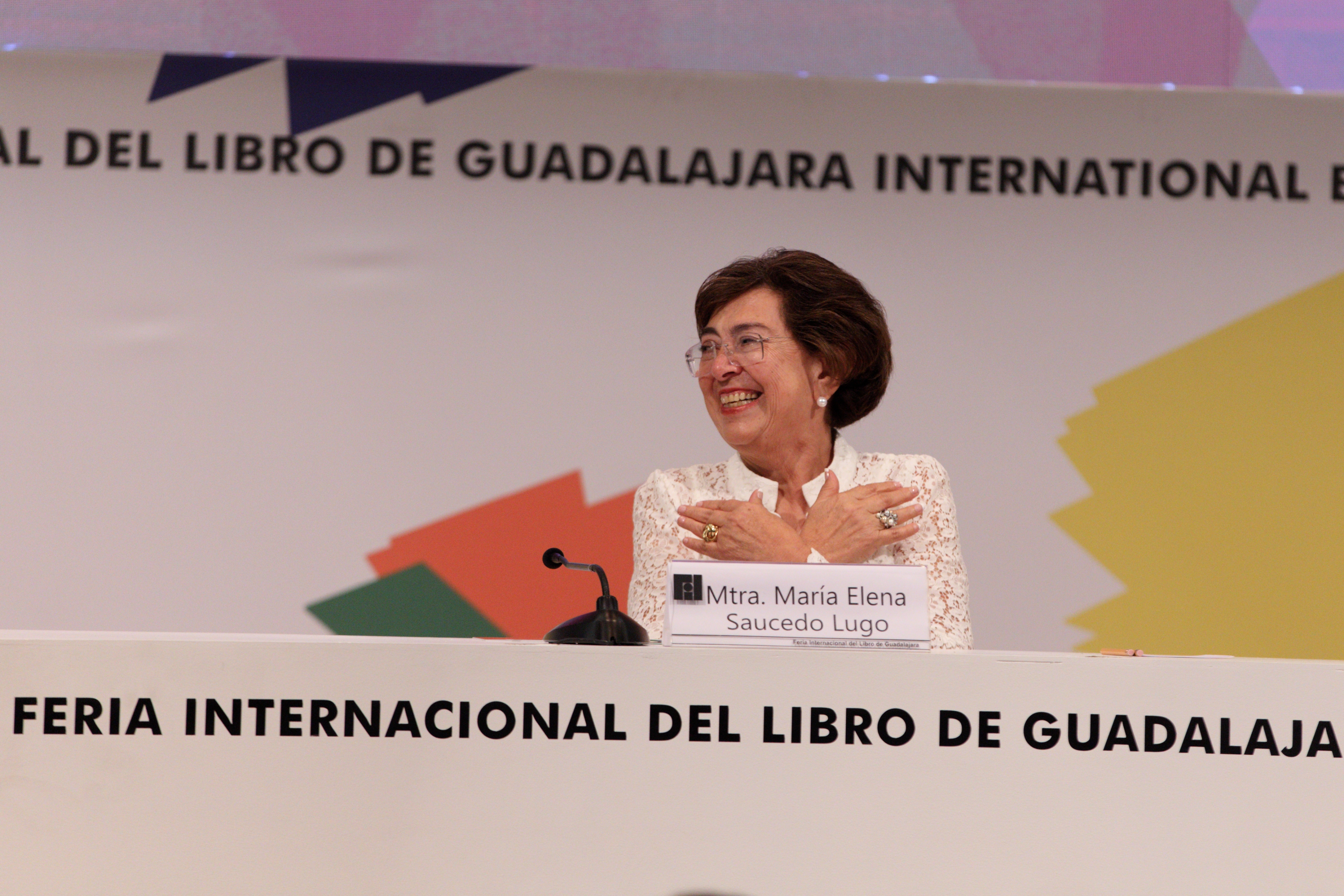 La maestra María Elena Saucedo Lugo recibió el Homenaje al Bibliotecario de manos del Presidente de la Feria Internacional del Libro de Guadalajara (FIL), maestro José Trinidad Padilla López, y que le fue otorgado por su labor de fomento a la lectura y la preservación de los libros.