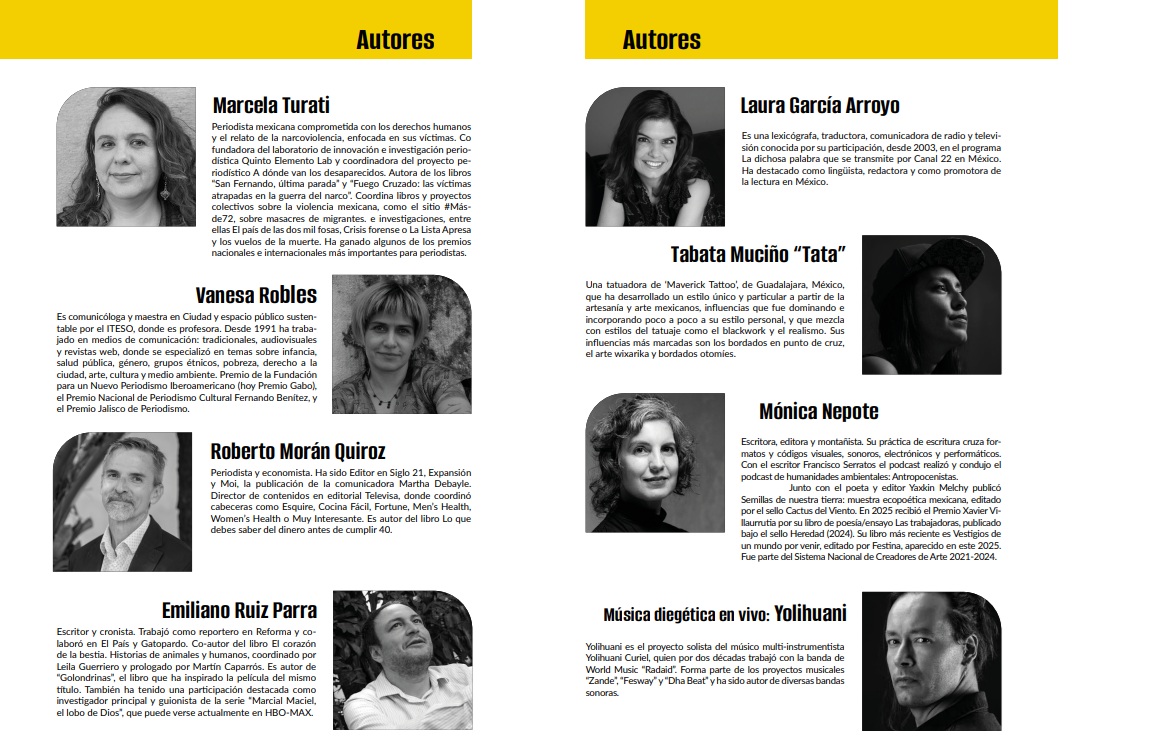 Los invitados hablarán y escucharán las vivencias de referentes en sus ámbitos: las y los periodistas Vanesa Robles, Marcela Turati, Emiliano Ruiz Parra y Roberto Morán Quiroz; la lexicógrafa y comunicadora Laura García Arroyo, la escritora Mónica Nepote y la tatuadora Tabata Muciño “Tata”.