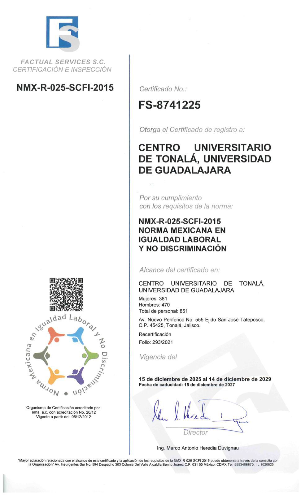 El Centro Universitario de Tonalá (CUTonalá) recibió, por segunda ocasión, la certificación NMX-R-025-SCFI-2015, una norma mexicana sobre igualdad laboral y no discriminación que mantiene desde el año 2021; es el único campus en certificarse en el rubro en toda la Red Universitaria.