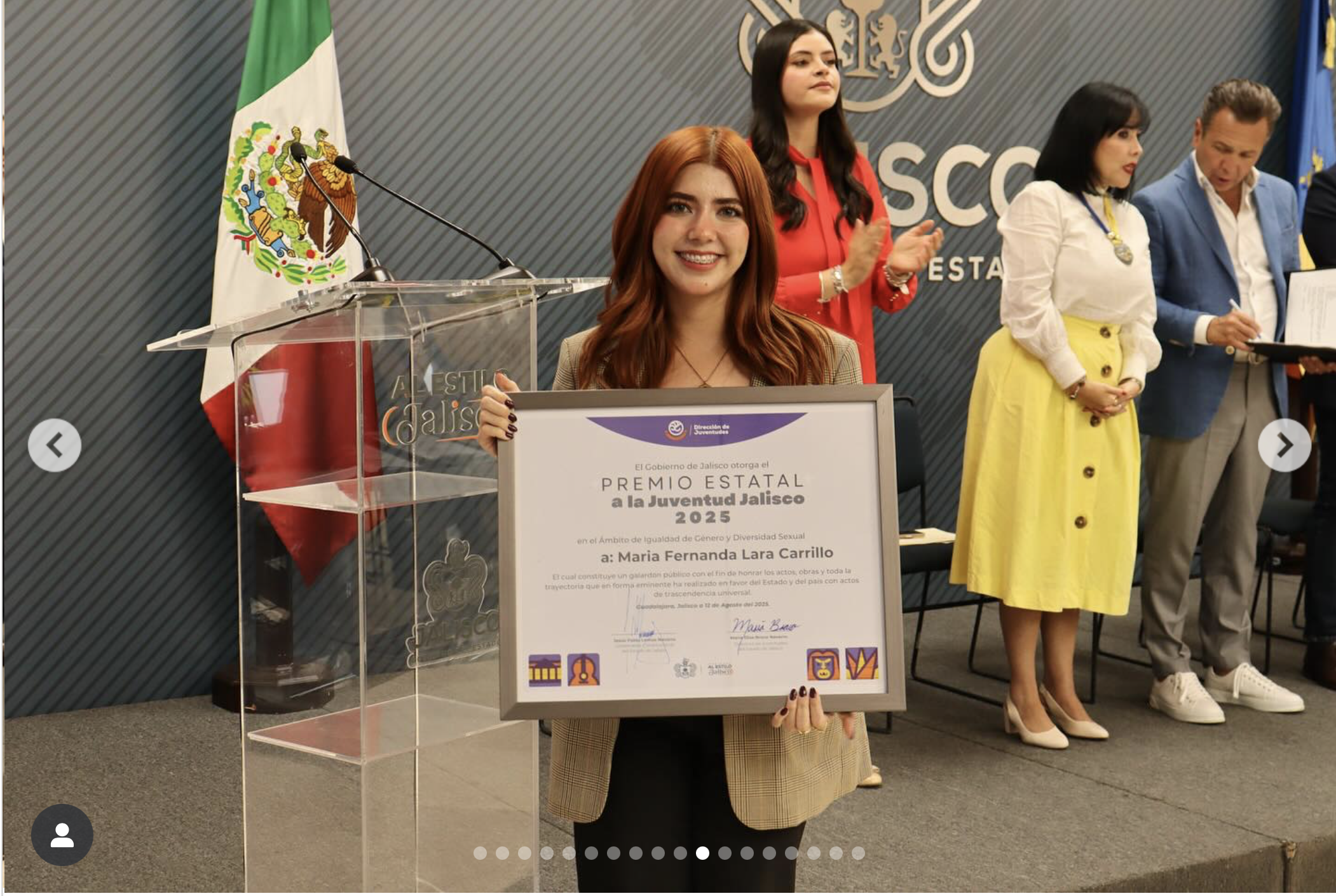 En el Ámbito de igualdad de género y diversidad sexual, la ganadora fue María Fernanda Lara Carrillo, activista por los derechos humanos con perspectiva feminista e interseccional. Es estudiante de la licenciatura en Relaciones internacionales por la UdeG, ha sido co-coordinadora de la Unidad de Género e Igualdad Sustantiva del Laboratorio Estudiantil de Políticas Públicas.