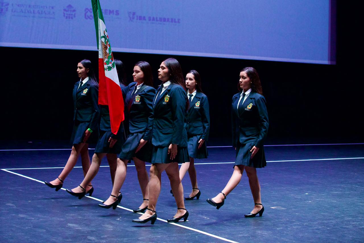 En total, la final del Concurso de Escoltas UDG 2025 y la exhibición de Bandas de Guerra reunió a 17 escuelas, ocho bandas y nueve escoltas; esto en total suma la participación de 350 estudiantes en el escenario de la Sala Plácido Domingo del Conjunto Santander de Artes Escénicas.