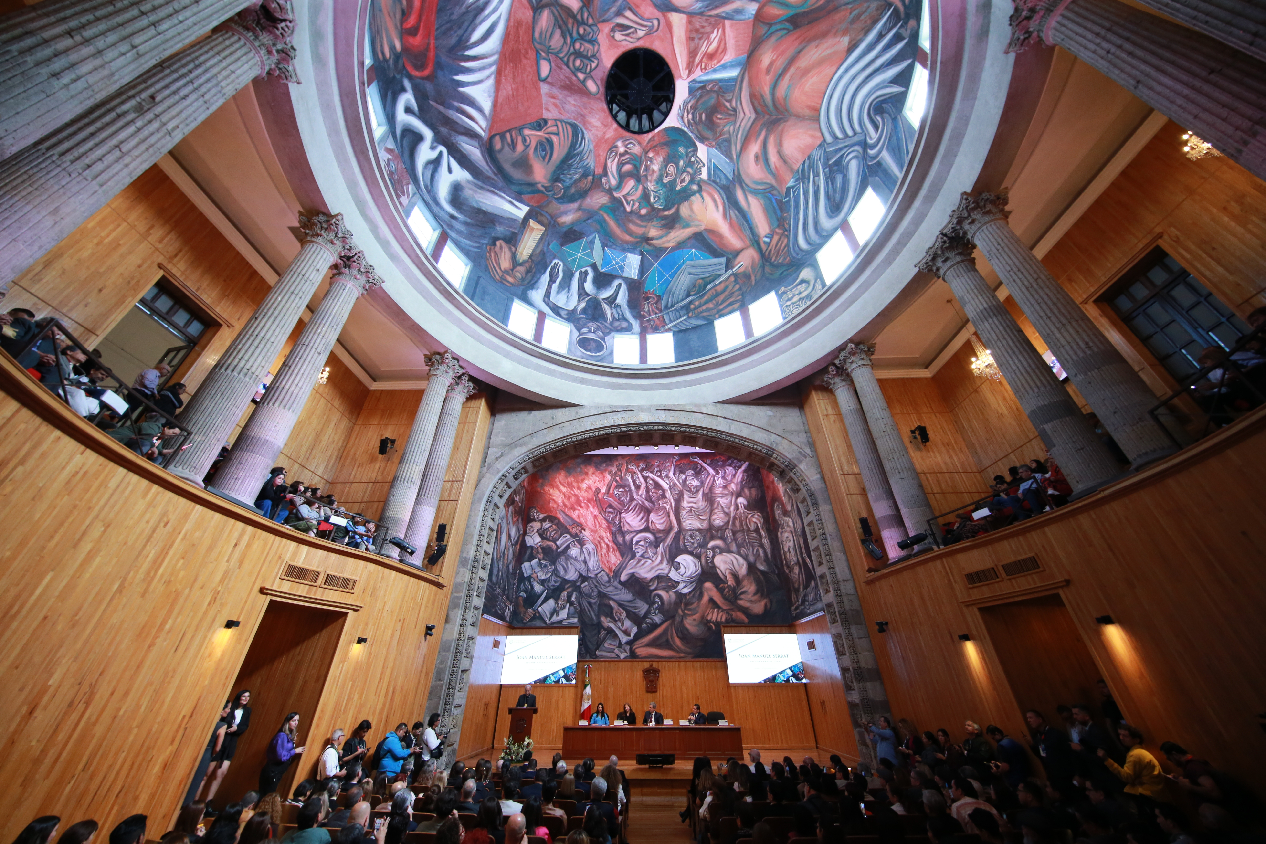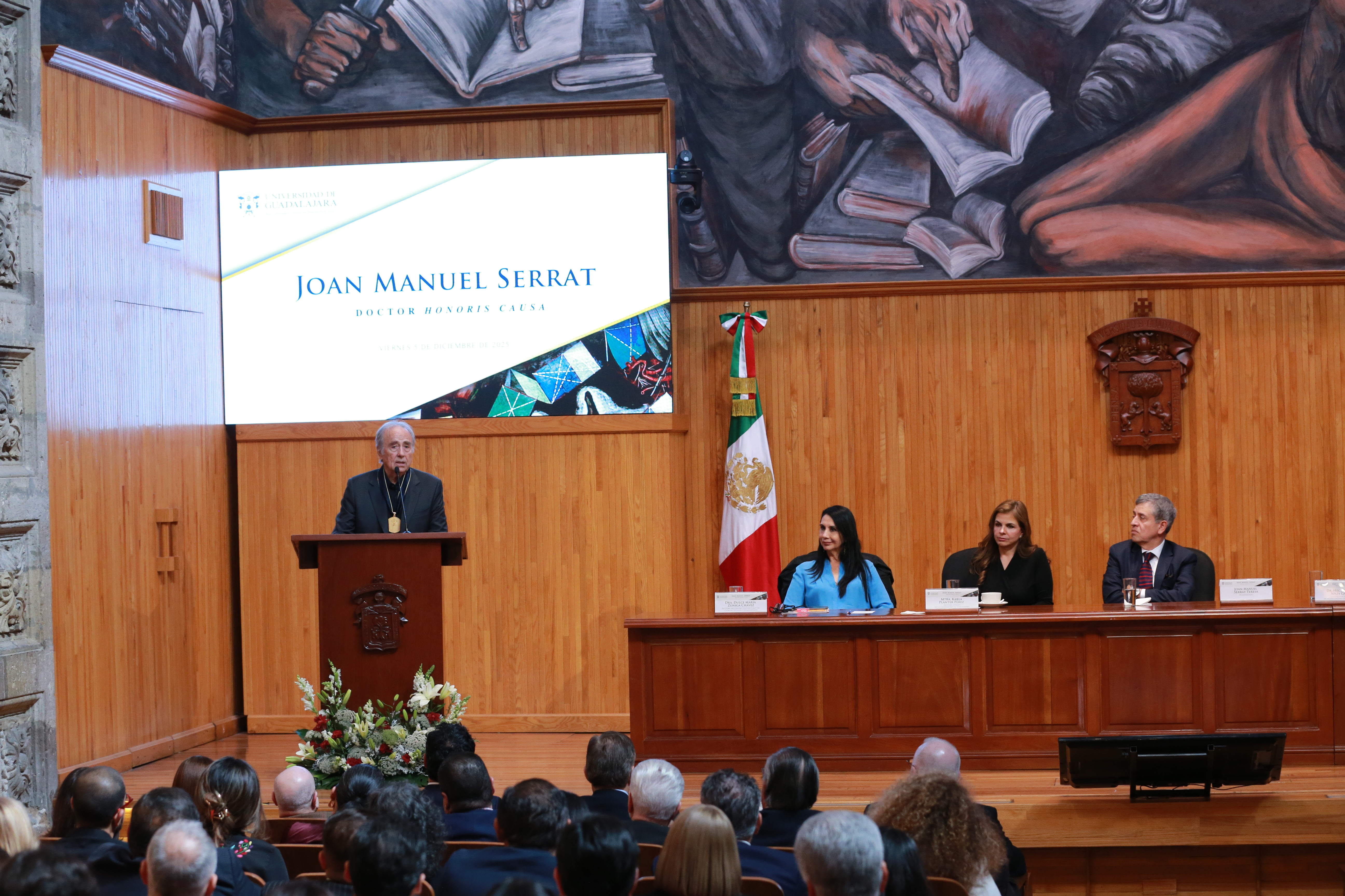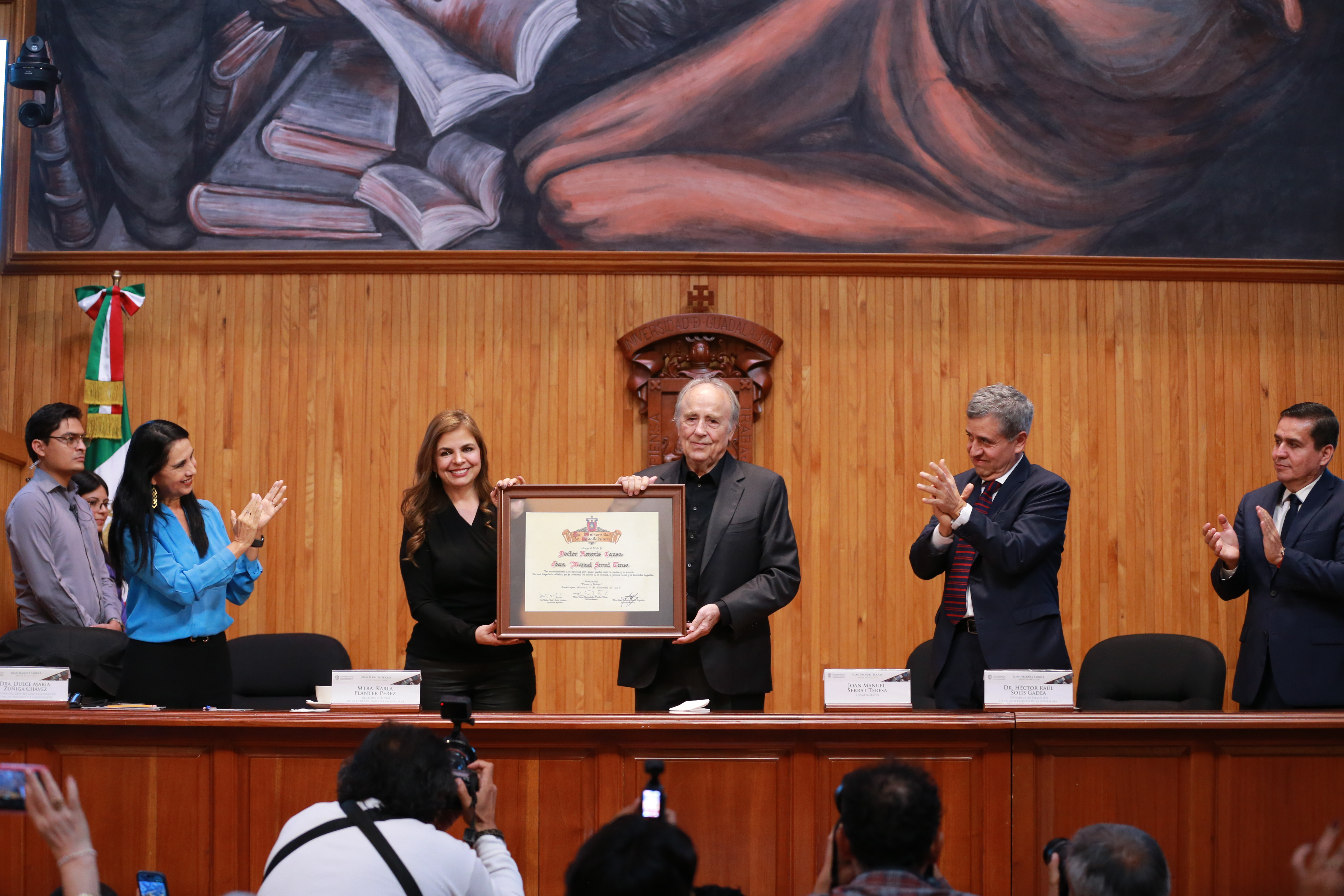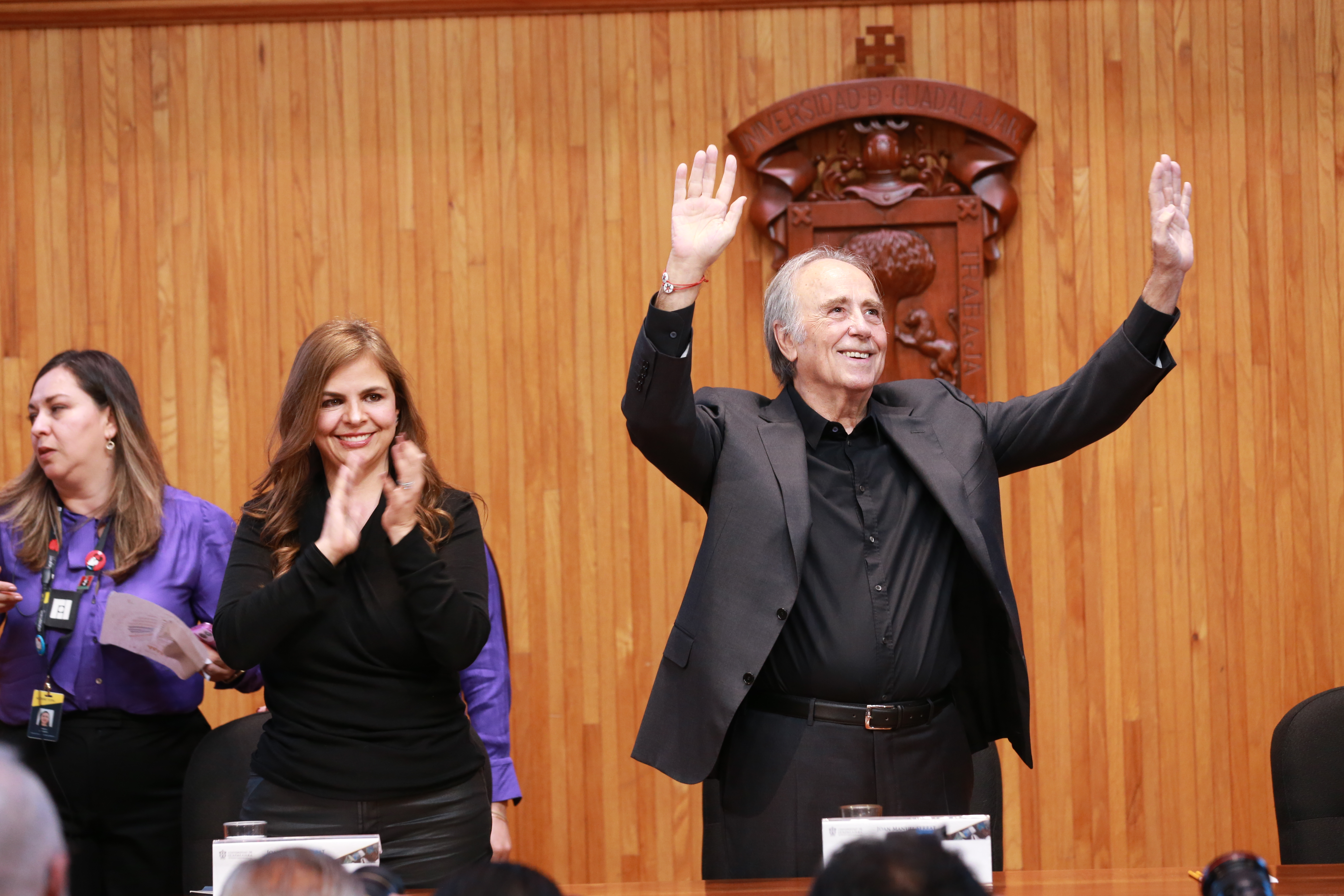 Con el fin de homenajear su trayectoria artística e intelectual, así como su invaluable contribución a la cultura en lengua española y catalana, y por su profundo compromiso humanista, la Universidad de Guadalajara (UdeG) le otorgó este mediodía el título de Doctor Honoris causa al guitarrista, compositor, cantante, poeta y escritor catalán Joan Manuel Serrat, nacido en 1943 en Barcelona.