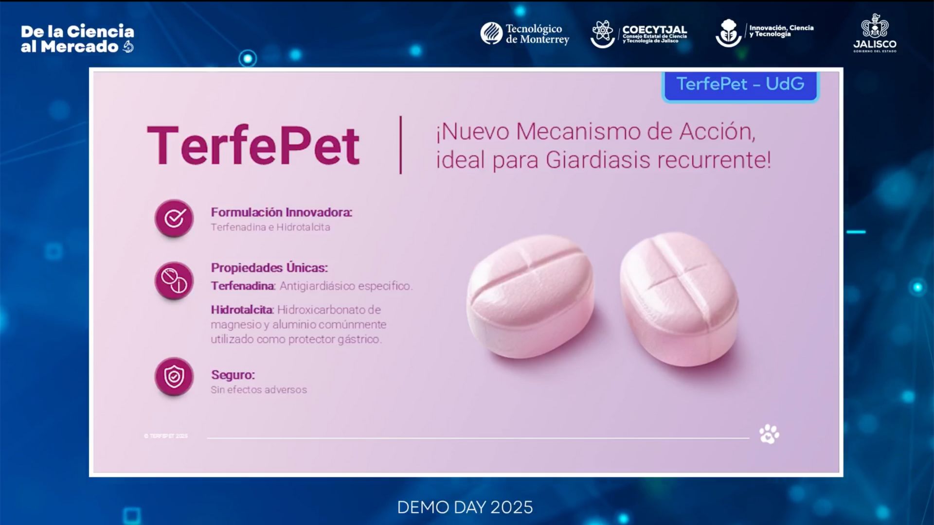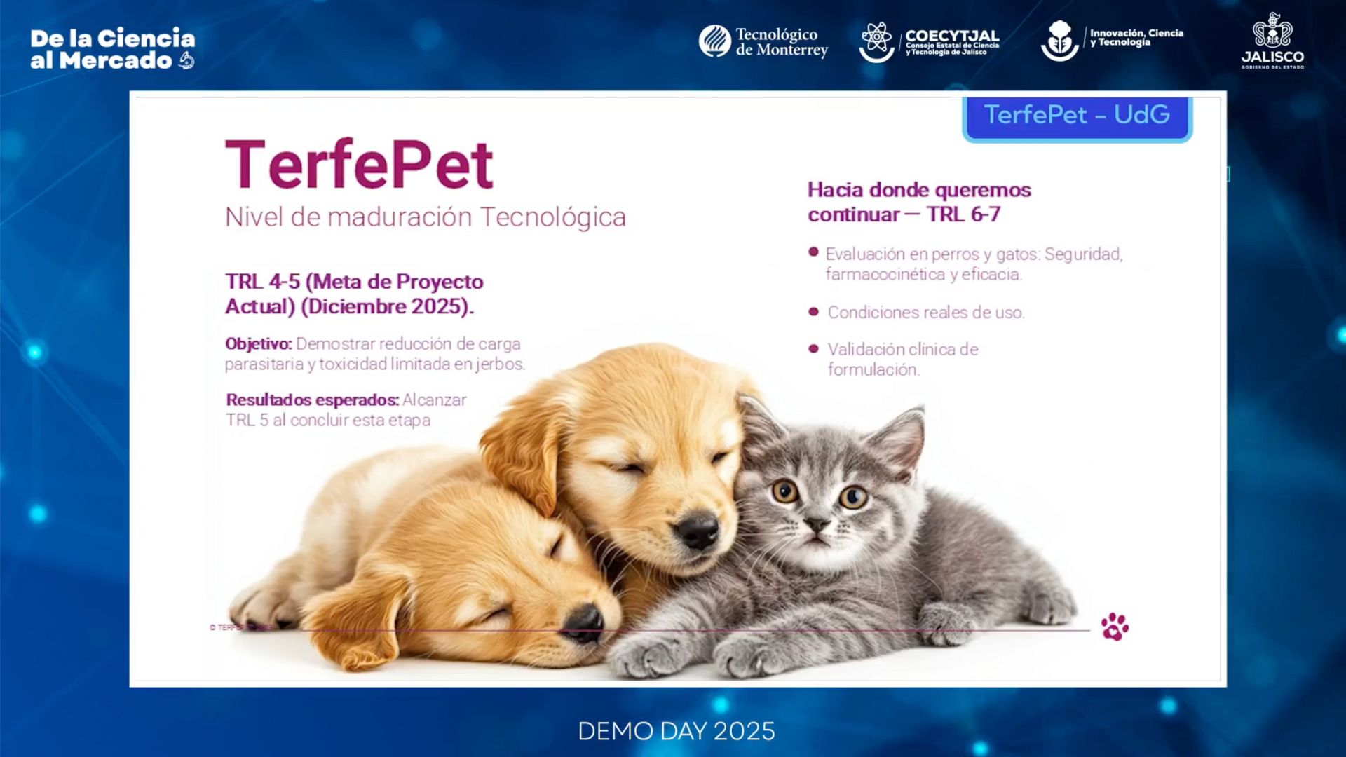 La Universidad de Guadalajara (UdeG) presentó el proyecto Terfepet durante el Demo Day de la cuarta generación del programa “De la Ciencia al Mercado”, evento convocado por la Secretaría de Innovación, Ciencia y Tecnología de Jalisco, con el propósito de impulsar la transferencia de desarrollos científicos hacia soluciones con valor comercial y social.