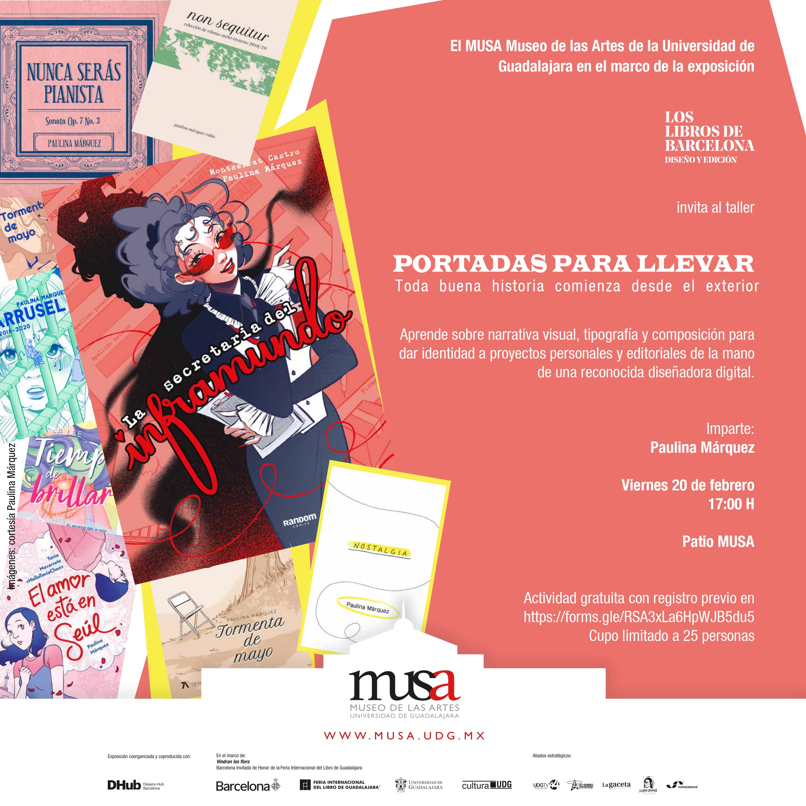 En tanto, el viernes 20 de febrero a las 17:00 horas se llevará a cabo el taller Portadas para llevar. Toda buena historia comienza desde el exterior, impartido por Paulina Márquez, en el marco de la muestra Los libros de Barcelona. Diseño y edición. Es gratuito con registro previo necesario, abierto a partir del 16 de febrero en el siguiente enlace: