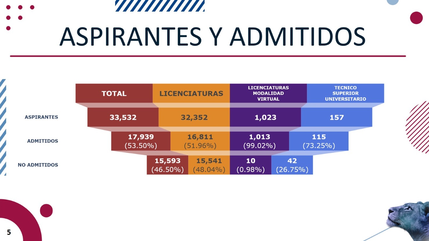 La Universidad de Guadalajara (UdeG) admitió a 17 mil 939 aspirantes para cursar una licenciatura en los diversos centros universitarios metropolitanos y regionales para el ciclo correspondiente al calendario 2026-A, lo que representa 53.50 por ciento de aspirantes admitidos, generando un aumento de más de 600 nuevos alumnos en comparación del ciclo 2025-A.