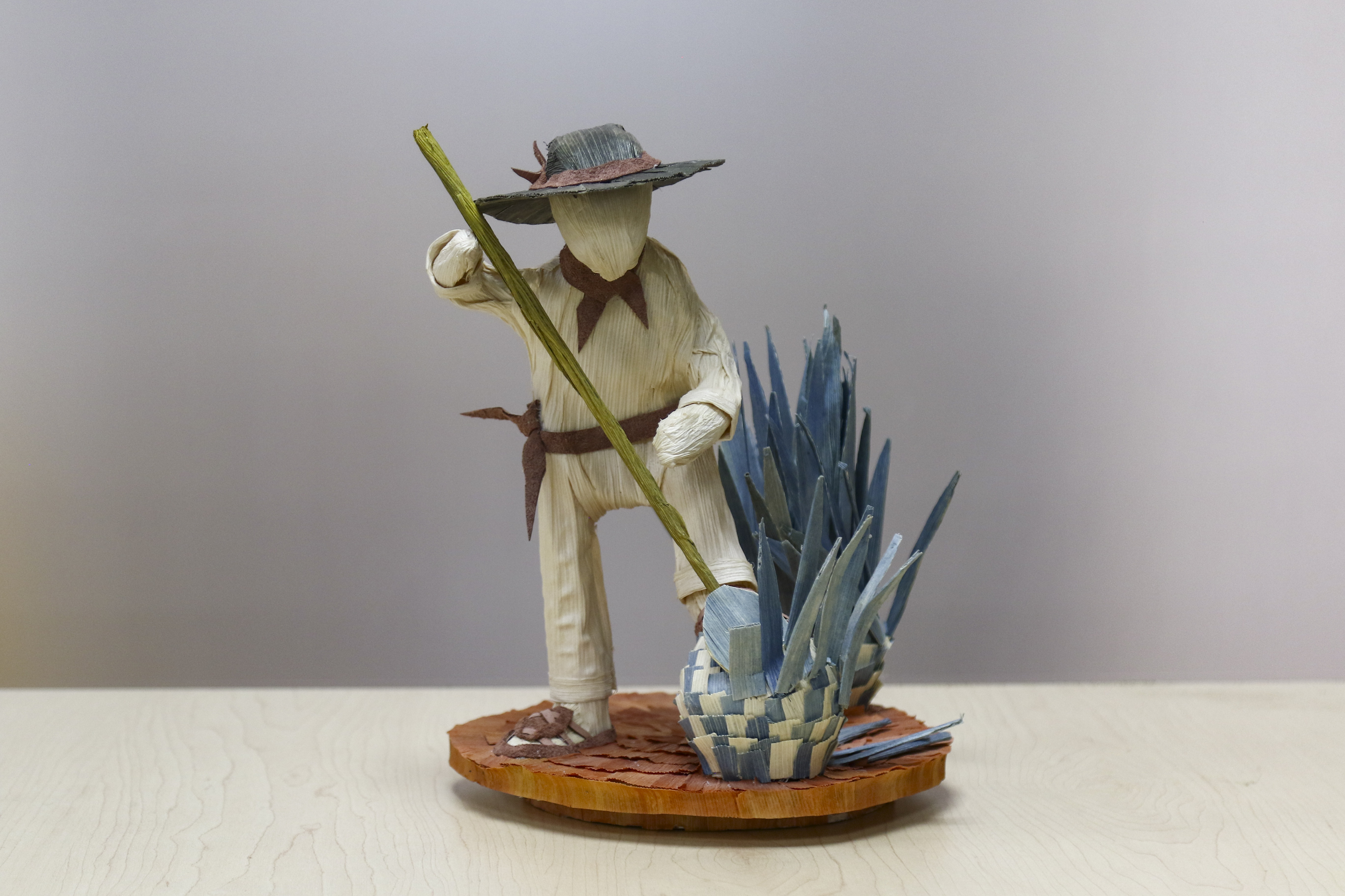 “Sé que hay artesanas y artesanos en diferentes partes de México, incluido Jalisco, que tiñen la hoja de maíz, principalmente con anilinas; su trabajo es muy bonito, pero a mí siempre me ha interesado que el material se muestre en su naturaleza, que al aproximarte a la pieza se vea la fibra, que te cuente parte de su historia el propio material, sobre todo en un campo mexicano en el que los cultivos tradicionales como el del maíz cada vez están más en riesgo. Para mí es importante que el producto del campo hable también de las personas, por eso mi trabajo casi siempre es de personajes”, explicó.