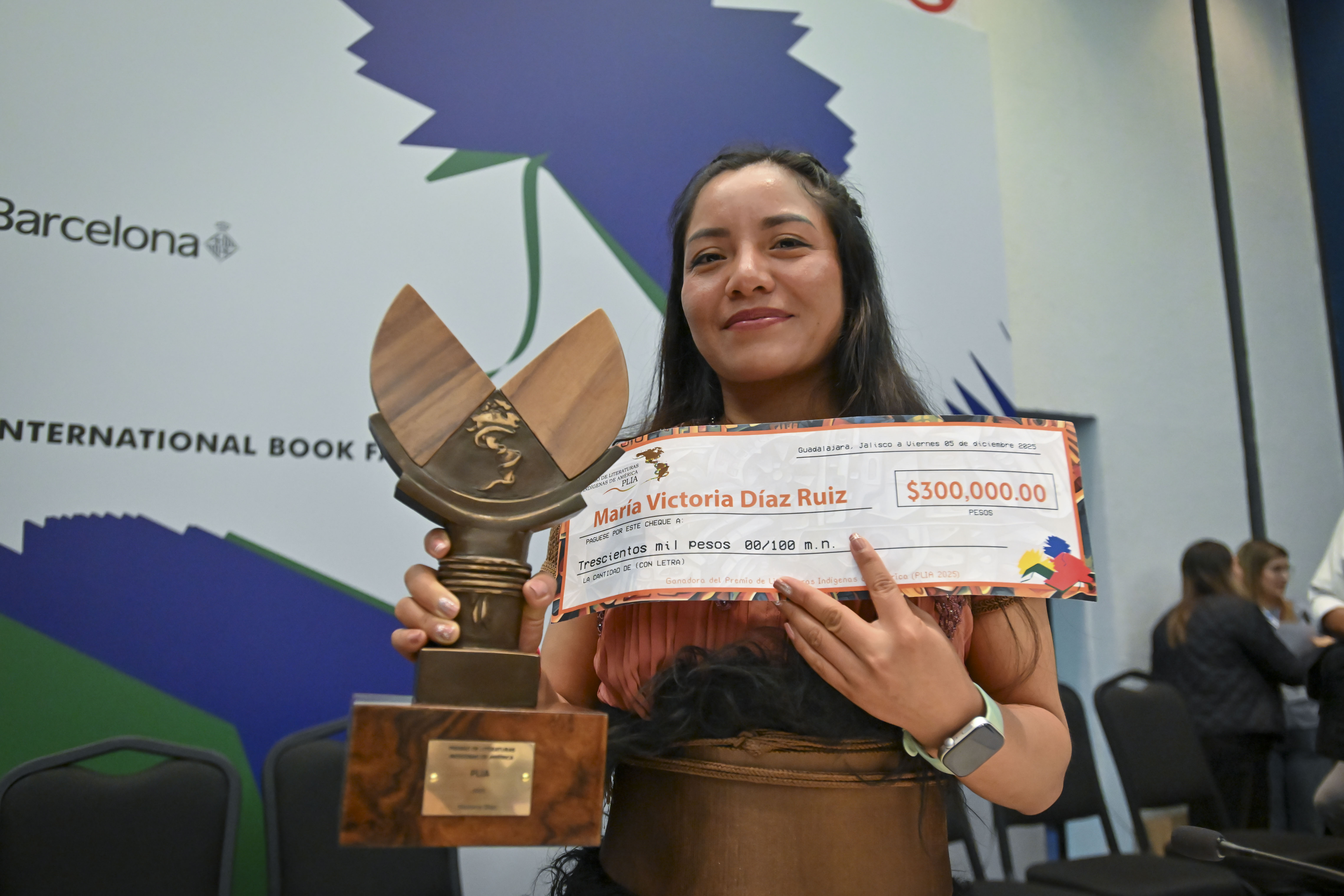 Además del reconocimiento, Victoria Díaz recibió de manos de la Rectora General de la Universidad de Guadalajara (UdeG), maestra Karla Planter Pérez, la estatuilla conmemorativa del PLIA 2025. El galardón incluye además un estímulo económico de 300 mil pesos.