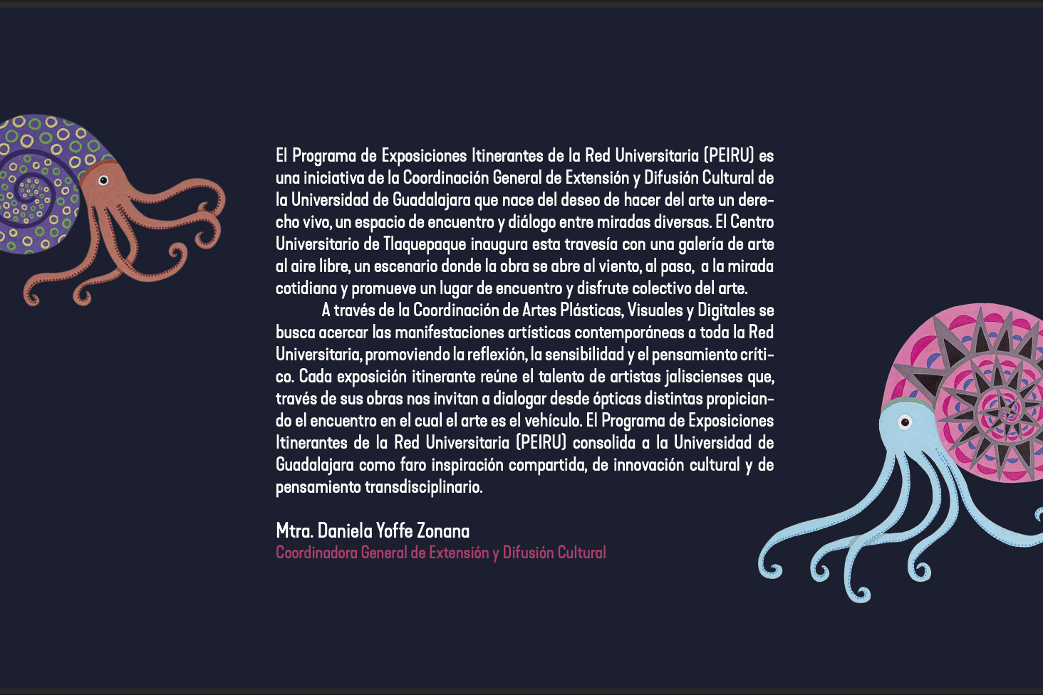 “Estas muestras tienen como tarea desarrollar y producir exposiciones a partir del talento de los artistas de nuestra comunidad, así como programar su itinerancia en los distintos centros universitarios. Comenzamos con ellas al inicio de este año en los distintos centros universitarios, como el de Tonalá (CUTonalá), de los Lagos (CULagos), de la Costa (CUCosta) y de la Costa Sur (CUCSur), entre otros”, dijo.
