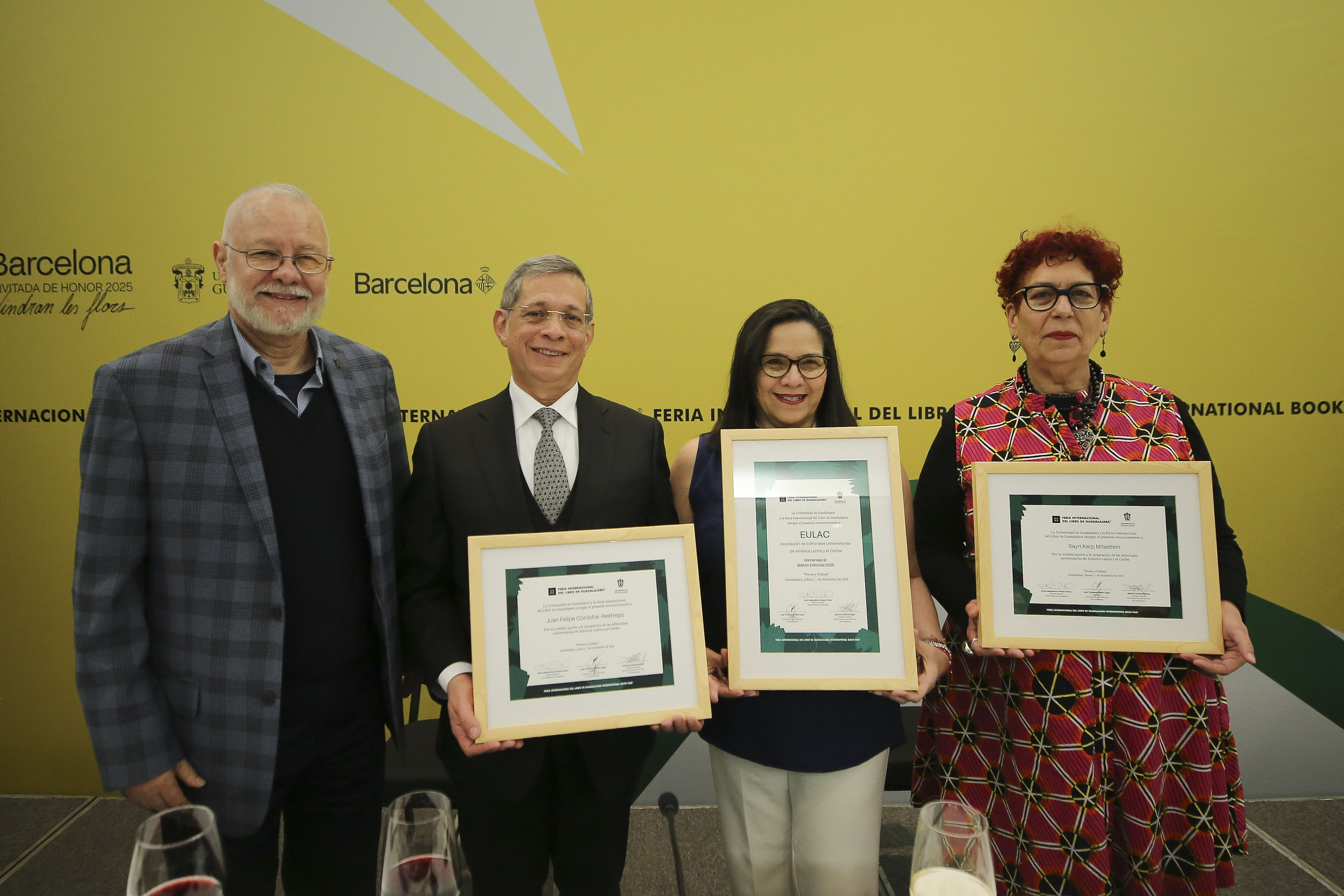 La Feria Internacional del Libro de Guadalajara (FIL) 2025 entregó este mediodía el Homenaje al Mérito Editorial a la Asociación de Editoriales Universitarias de América Latina y el Caribe (EULAC), distinción que fue recibida por su actual Presidenta, Lía Castillo Meneses; y a quienes la dirigieron anteriormente: Sayri Karp Mitastein, actual Directora de la Editorial de la Universidad de Guadalajara y Juan Felipe Córdoba-Restrepo, Director de la Editorial de la Universidad del Rosario.