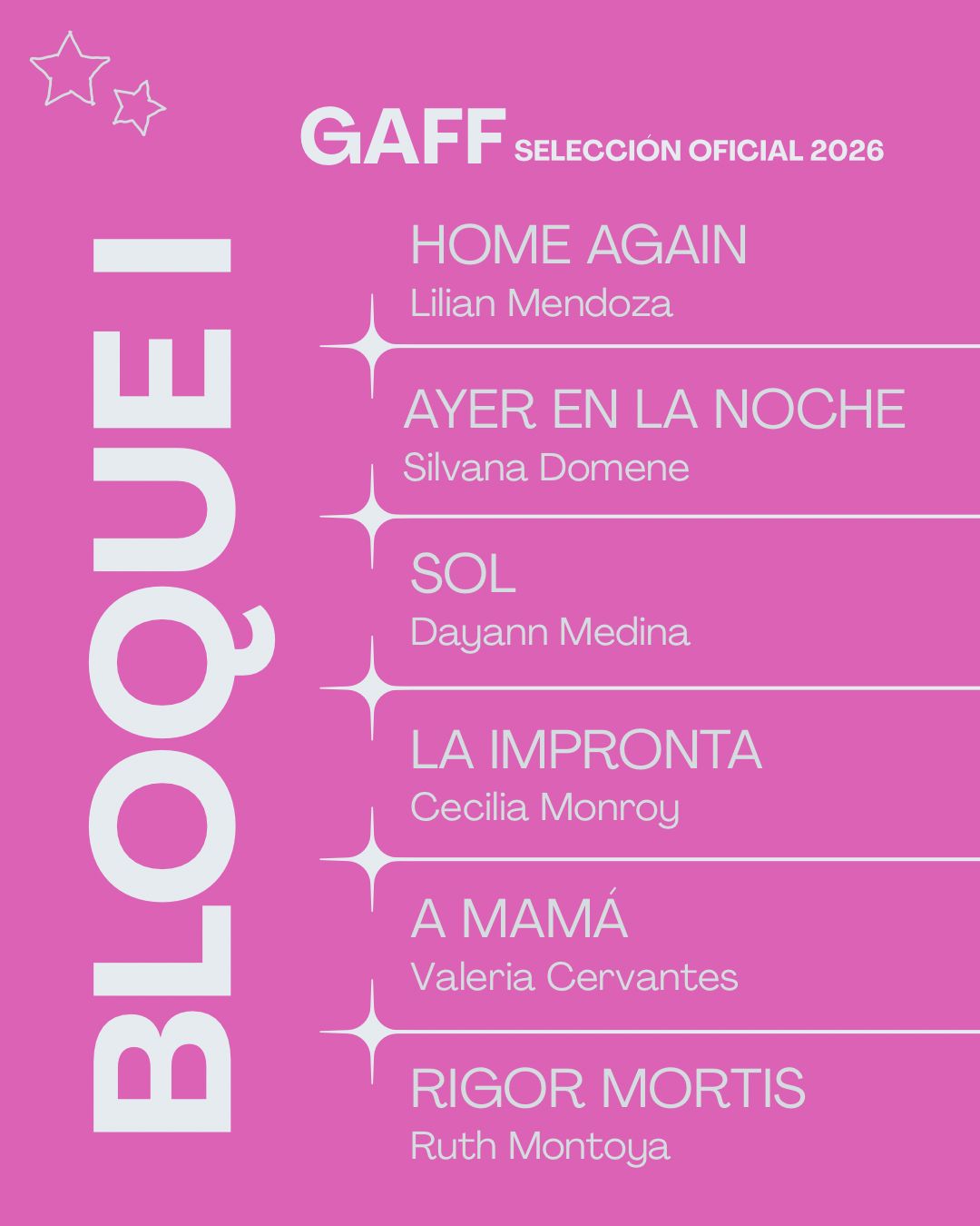 En esta primera edición, el GAFF exhibirá únicamente cortometrajes locales, entre los que destacan Home again, de Lilián Mendoza; A mamá, de Valeria Cervantes y Nudos, de Lorena Flores, entre otros.