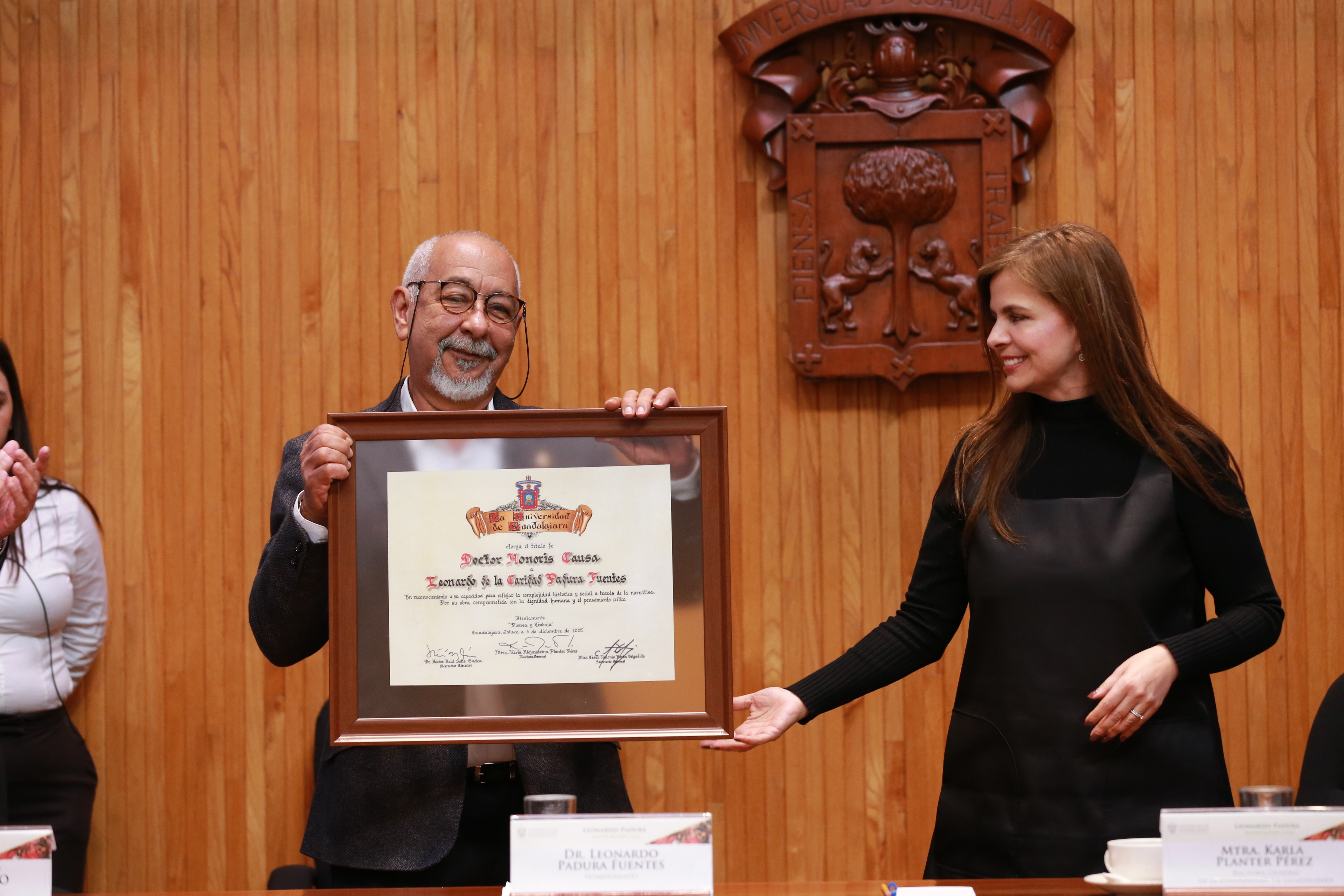 “Hoy, la UdeG le entrega este título a Leonardo Padura en reconocimiento por su capacidad de reflejar la verdad histórica a través de la narrativa y por promover siempre los valores de la libertad, el pensamiento crítico y el humanismo”, agregó Planter Pérez.