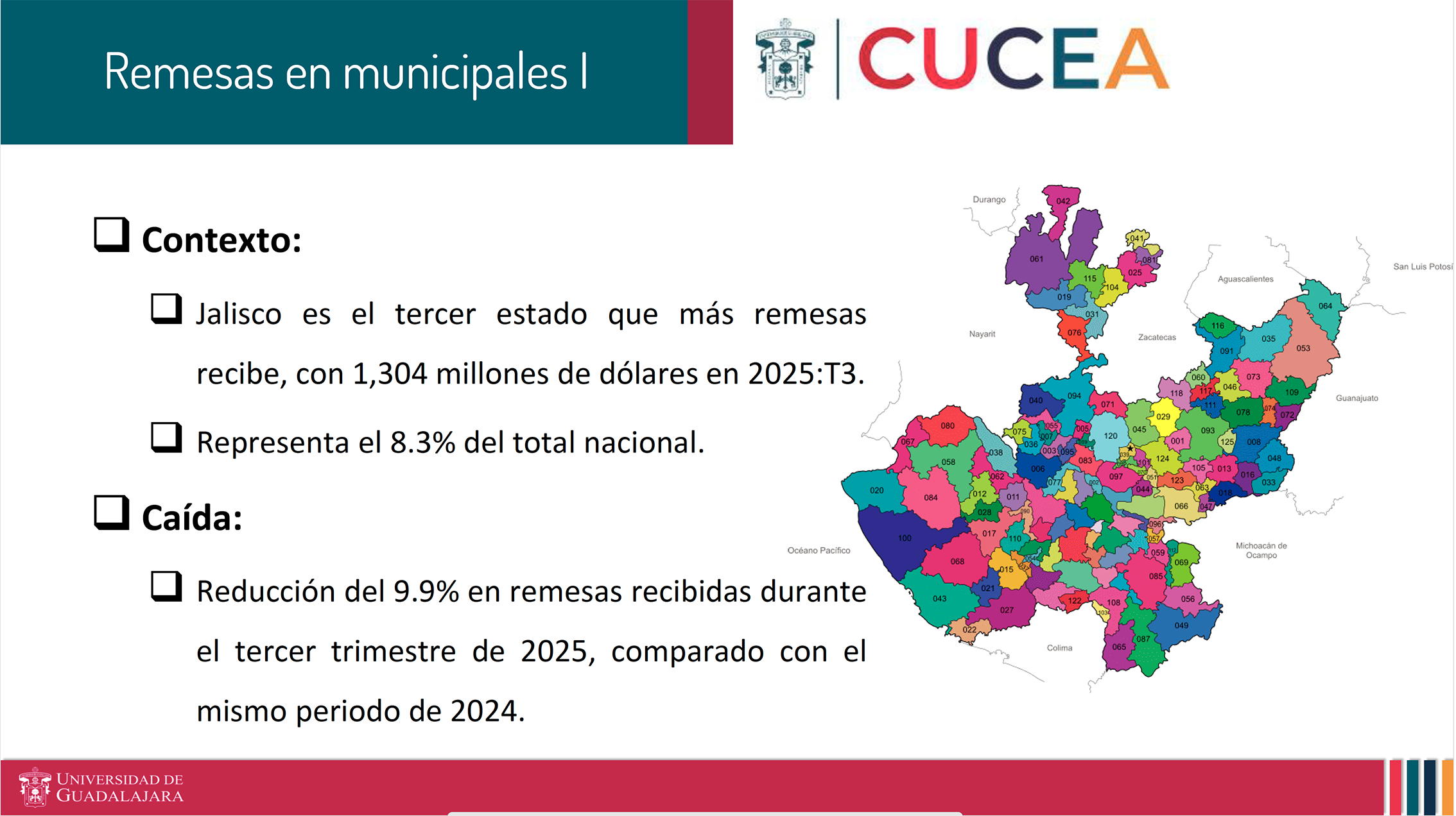 Agregó que nuestra entidad se mantiene como la tercera receptora (después de Guanajuato y Michoacán), captando 8.3 por ciento del total nacional, mientras que Guadalajara y Zapopan siguen liderando en monto, pero su economía está diversificada.