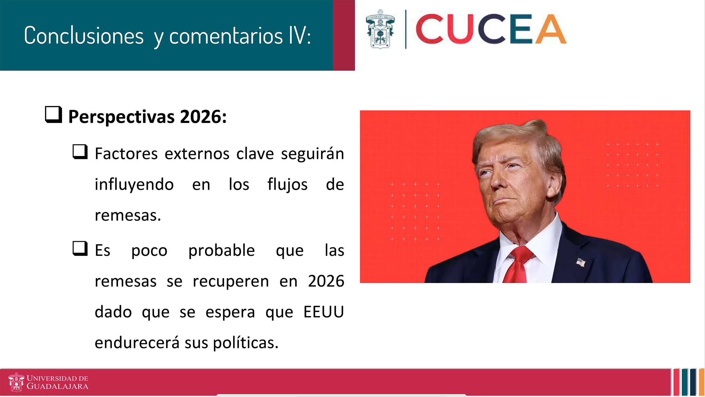 El investigador del Departamento de Economía del Centro Universitario de Ciencias Económico Administrativas (CUCEA), doctor Clemente Hernández Rodríguez, explicó que no estamos ante una fluctuación cíclica, sino ante un choque estructural derivado de la política de asfixia financiera migratoria de la administración de Donald Trump.