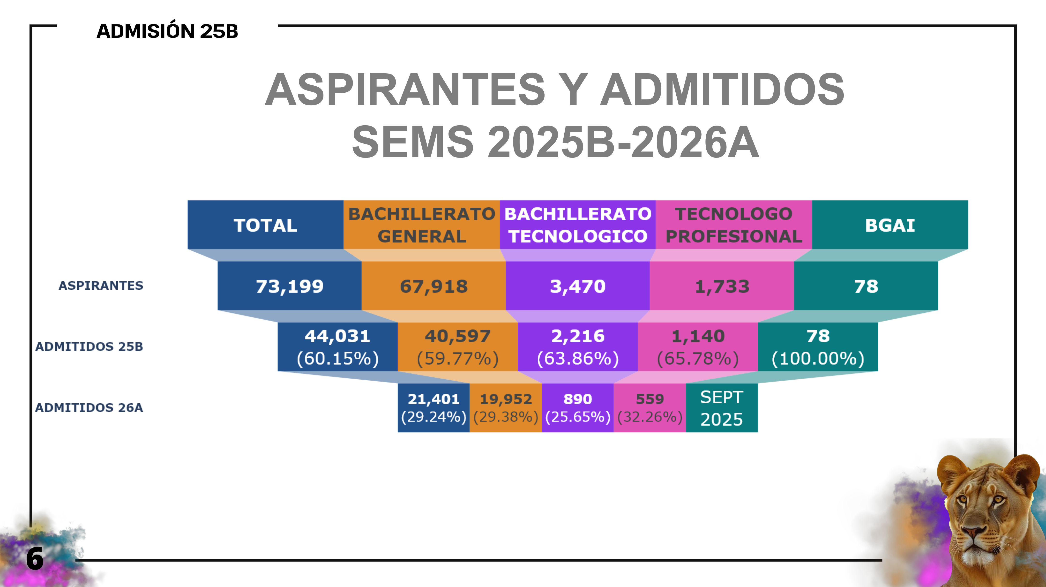 La Directora de Trámite y Control Escolar del SEMS, licenciada Diana Gómez Guerrero, informó que 65 mil 432 aspirantes fueron admitidos y más de 60 por ciento de ellos se integrarán a las aulas de las 178 sedes del SEMS durante este calendario, mientras que el 40 por ciento restante se incorporará en el mes de enero, para el calendario 2026-A.