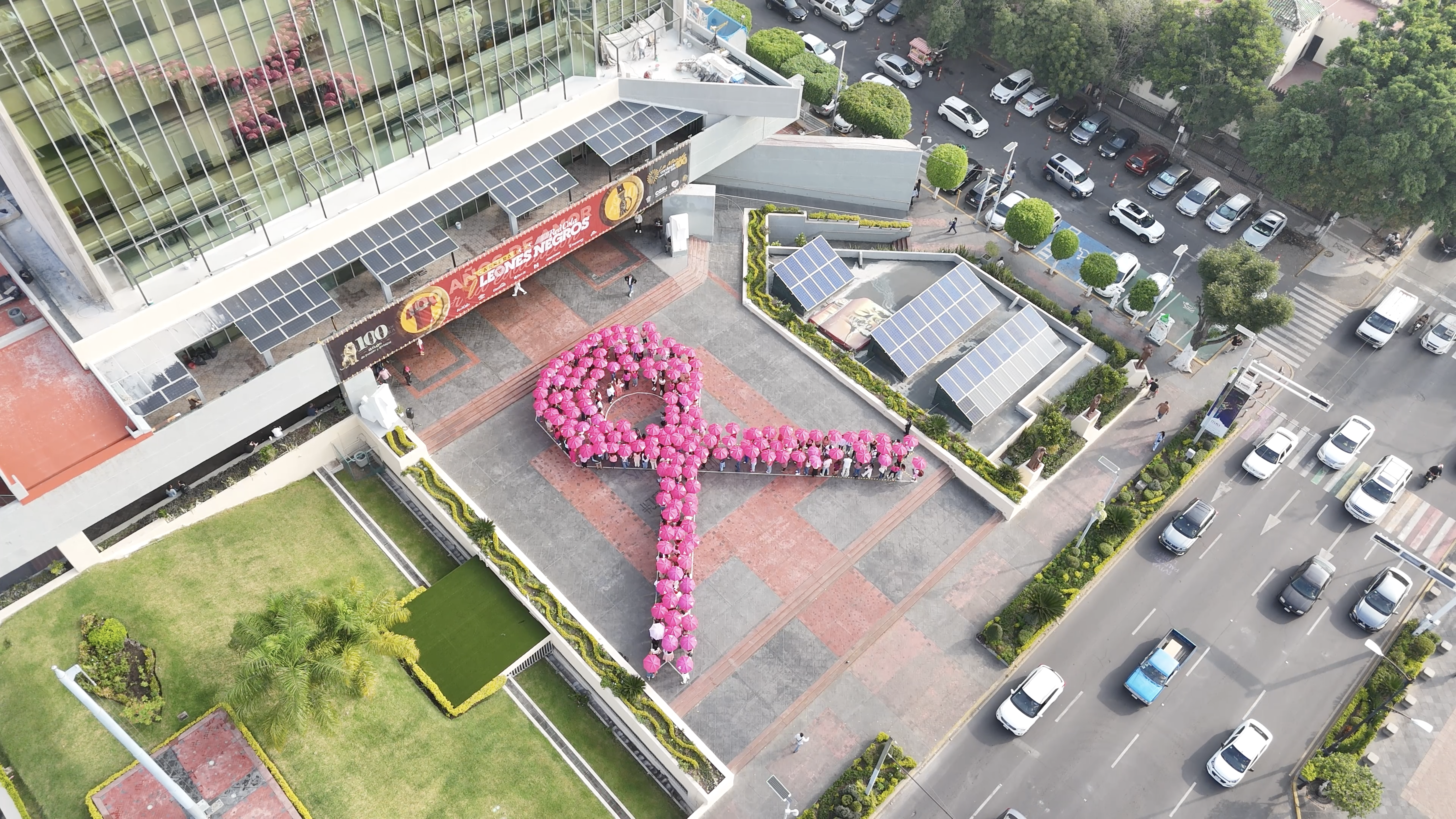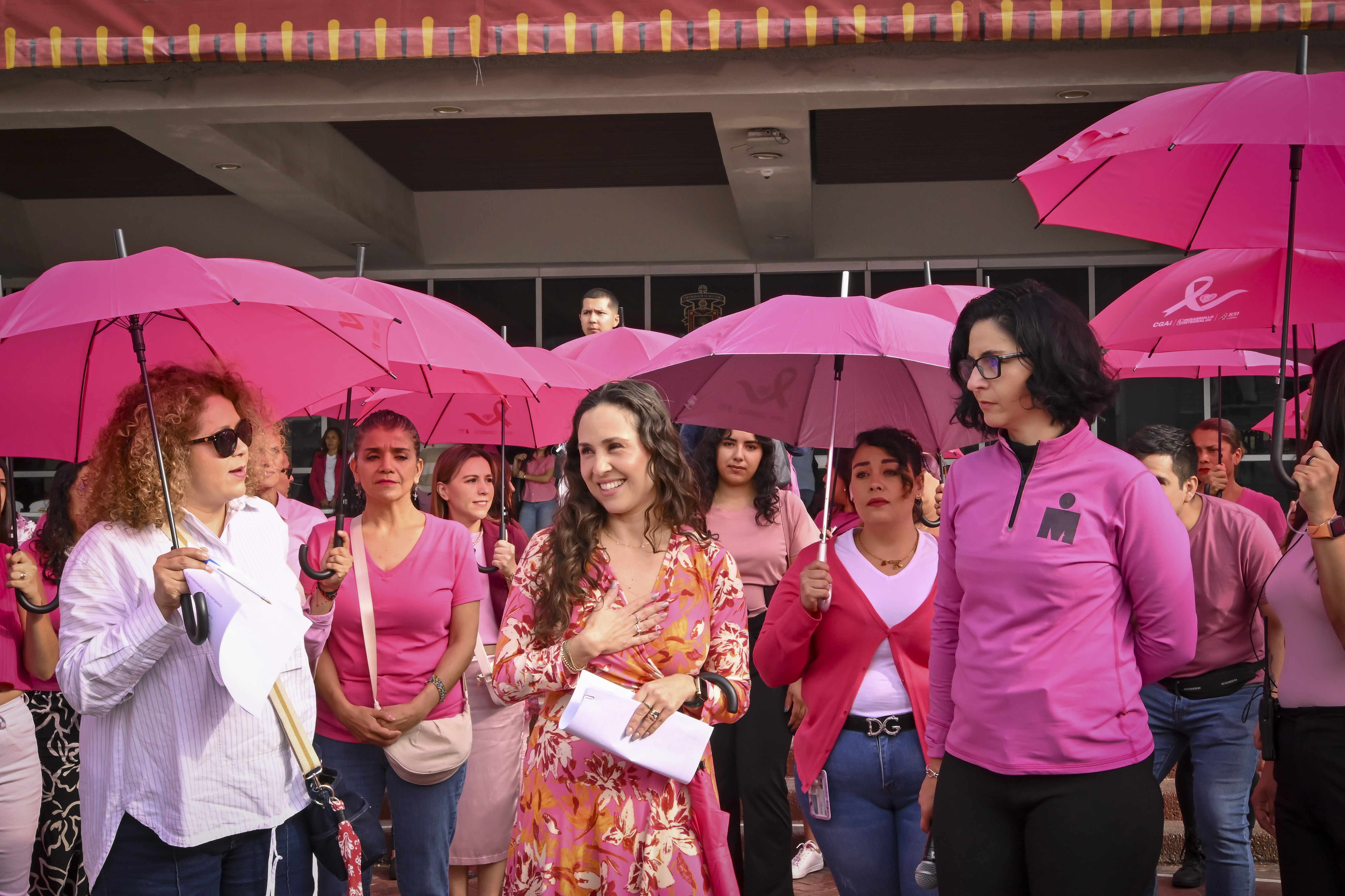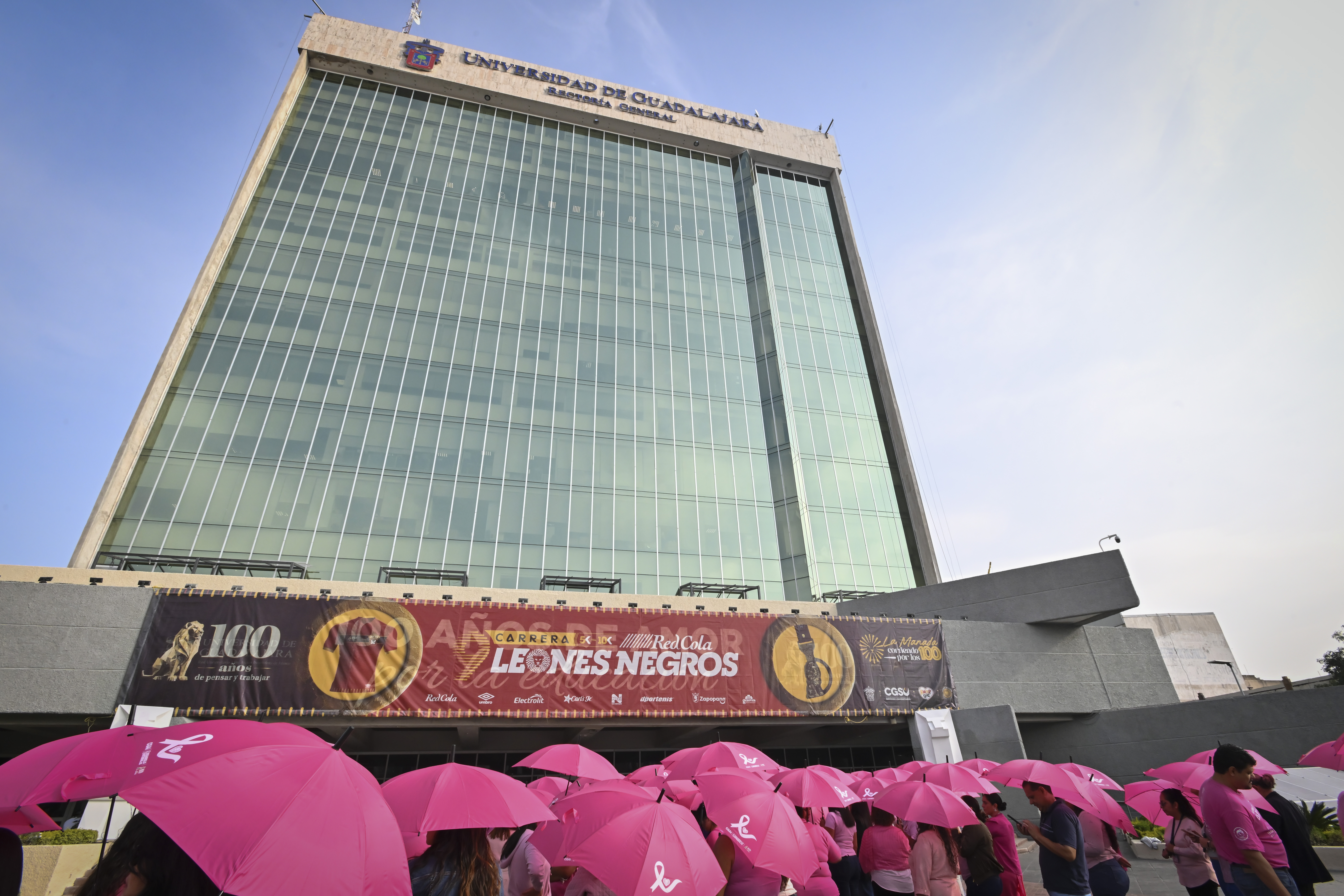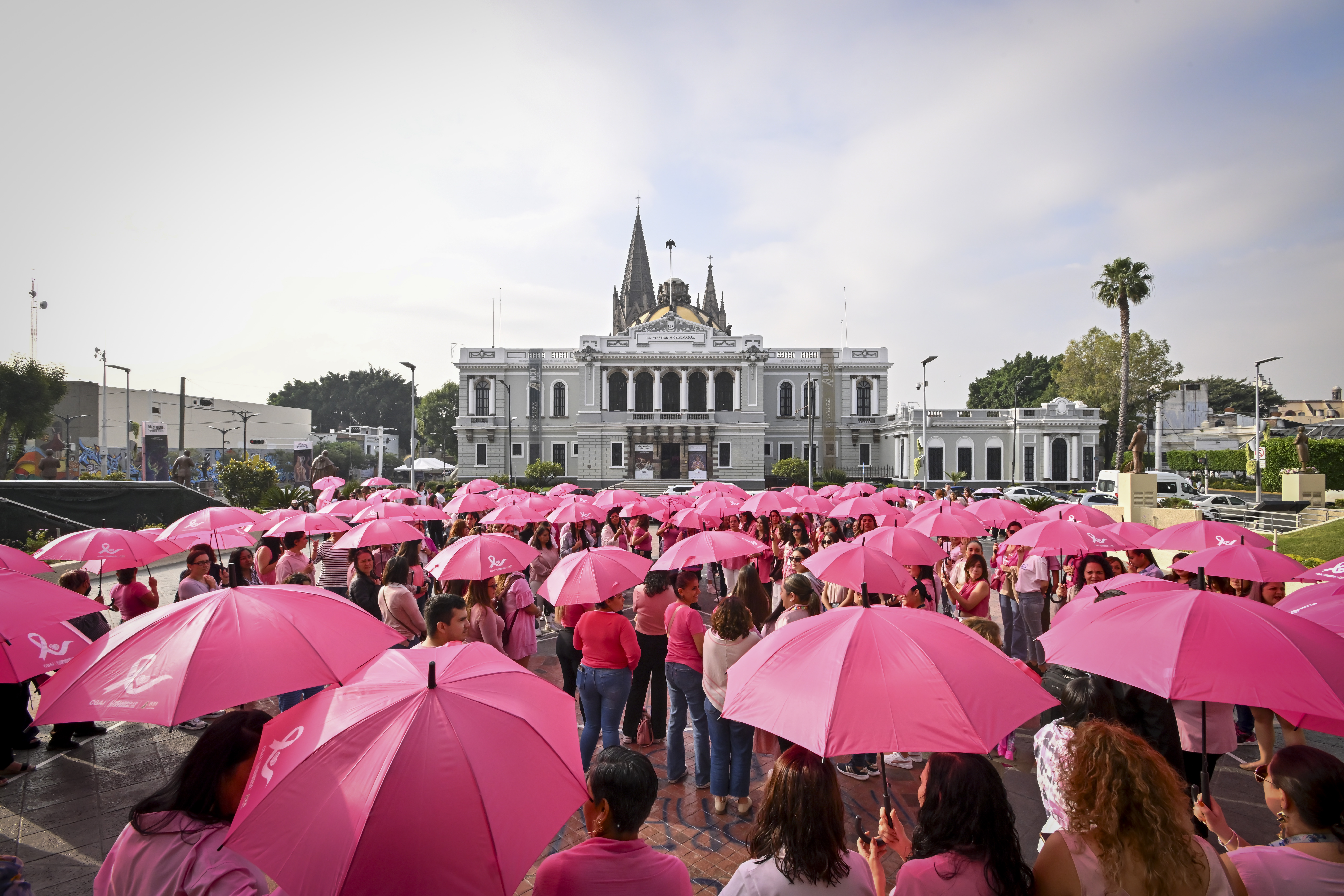 Con sombrillas y vestimenta rosas; esperanza, solidaridad y un pase de lista, autoridades universitarias, estudiantes, docentes y personal administrativo se reunieron en la explanada del edificio de Rectoría General de la Universidad de Guadalajara (UdeG) para formar un gran lazo humano que simbolizó la unión en la lucha contra el cáncer de mama.