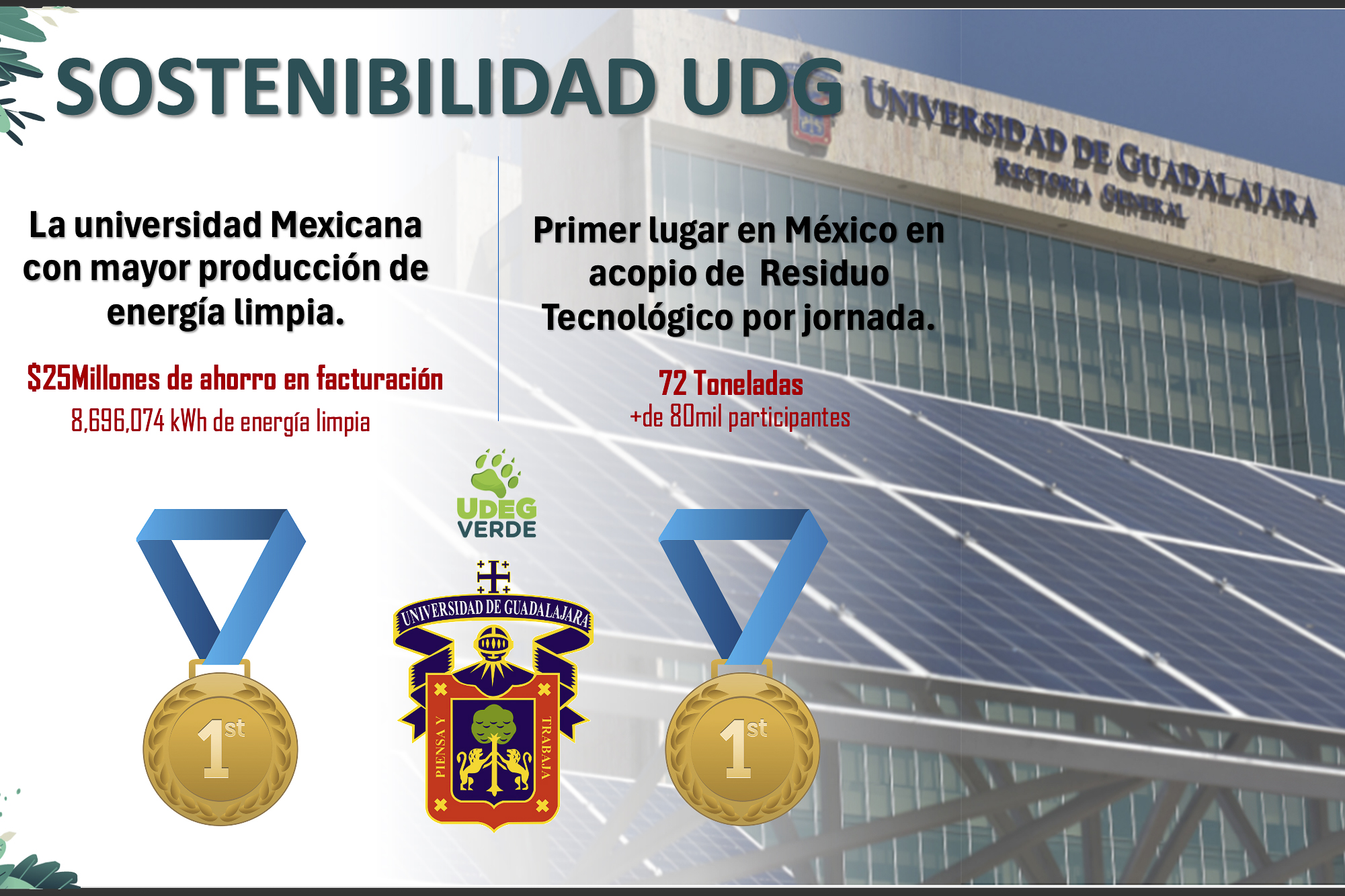 La Universidad de Guadalajara (UdeG) logró el primer lugar nacional en el acopio de residuo tecnológico y como la universidad mexicana con mayor producción de energía limpia, gracias al programa UdeG Verde, en el que ha desplegado diversas acciones para mitigar el cambio climático y hacer más eficientes sus recursos energéticos; esto lo anunció en conferencia de prensa la maestra Graciela Domínguez López, Coordinadora de Sostenibilidad, de la Coordinación General de Servicios Administrativos e Infraestructura Tecnológica (CGSAIT).