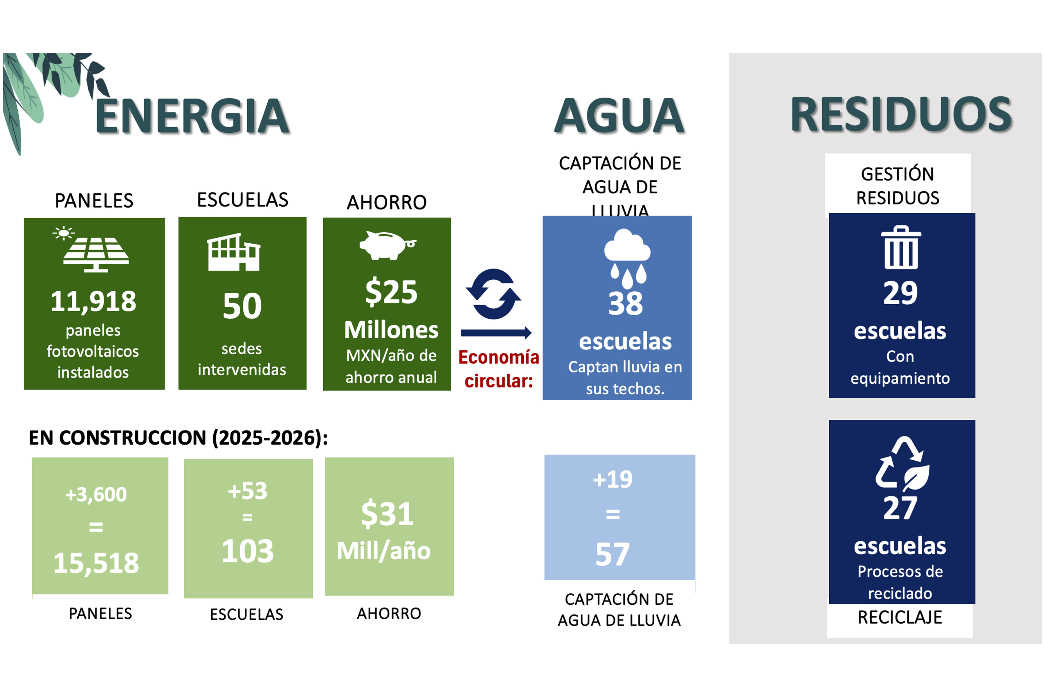 Detalló que están en fase de construcción e instalación de tres mil 600 paneles fotovoltaicos para 53 nuevas escuelas y dependencias, para llegar a 15 mil 518 en toda la red; con estas nuevas obras se estima un ahorro anual adicional de 25 millones de pesos en facturación eléctrica.