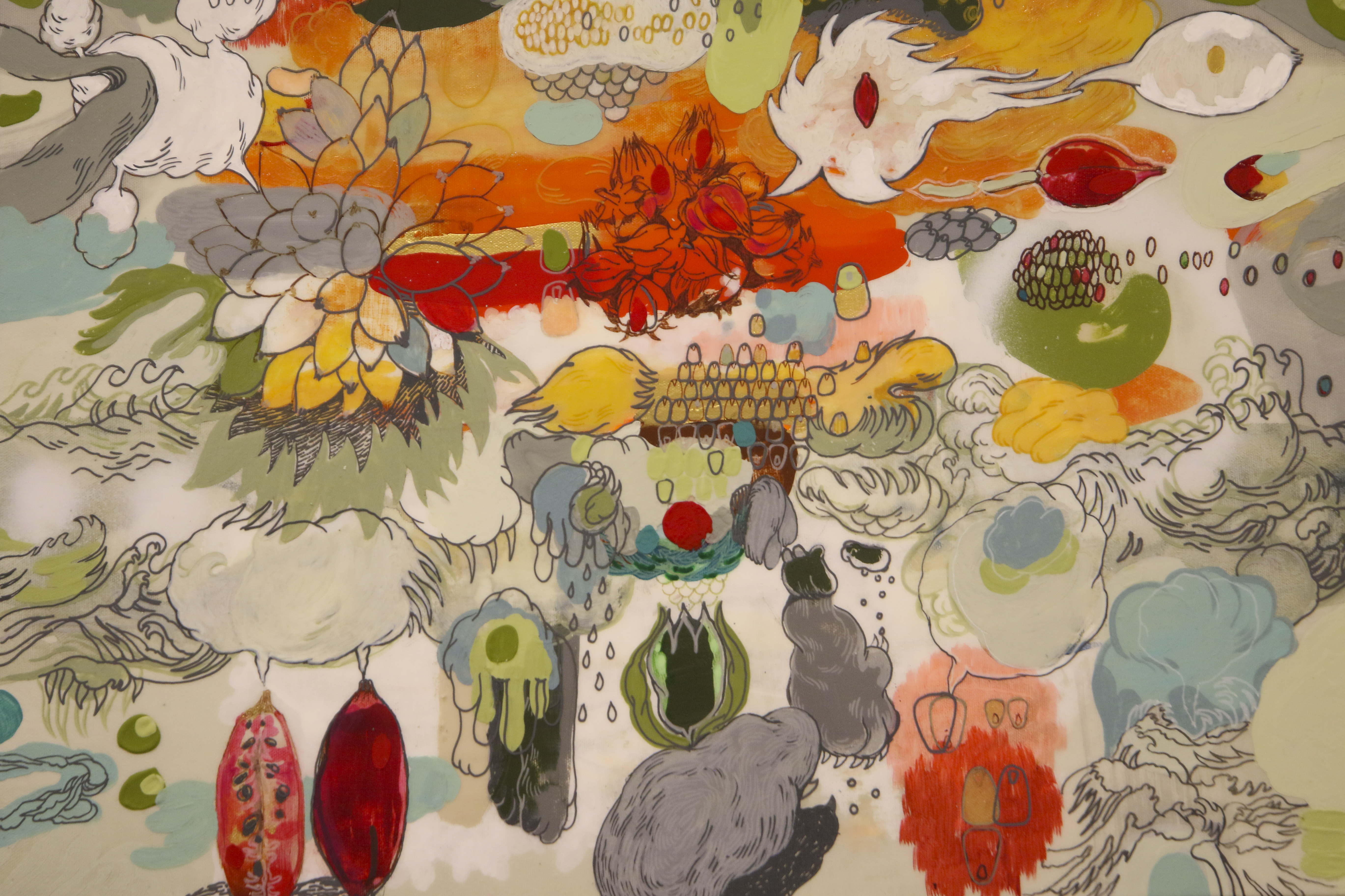 Los formatos grandes e hipnóticos, con colores vibrantes, llamativos, invitan a quien los observa a estar cerca, muy cerca, para descubrir los pequeños personajes, escritos o símbolos que se esconden dentro de la grandeza de lo contemporáneo.